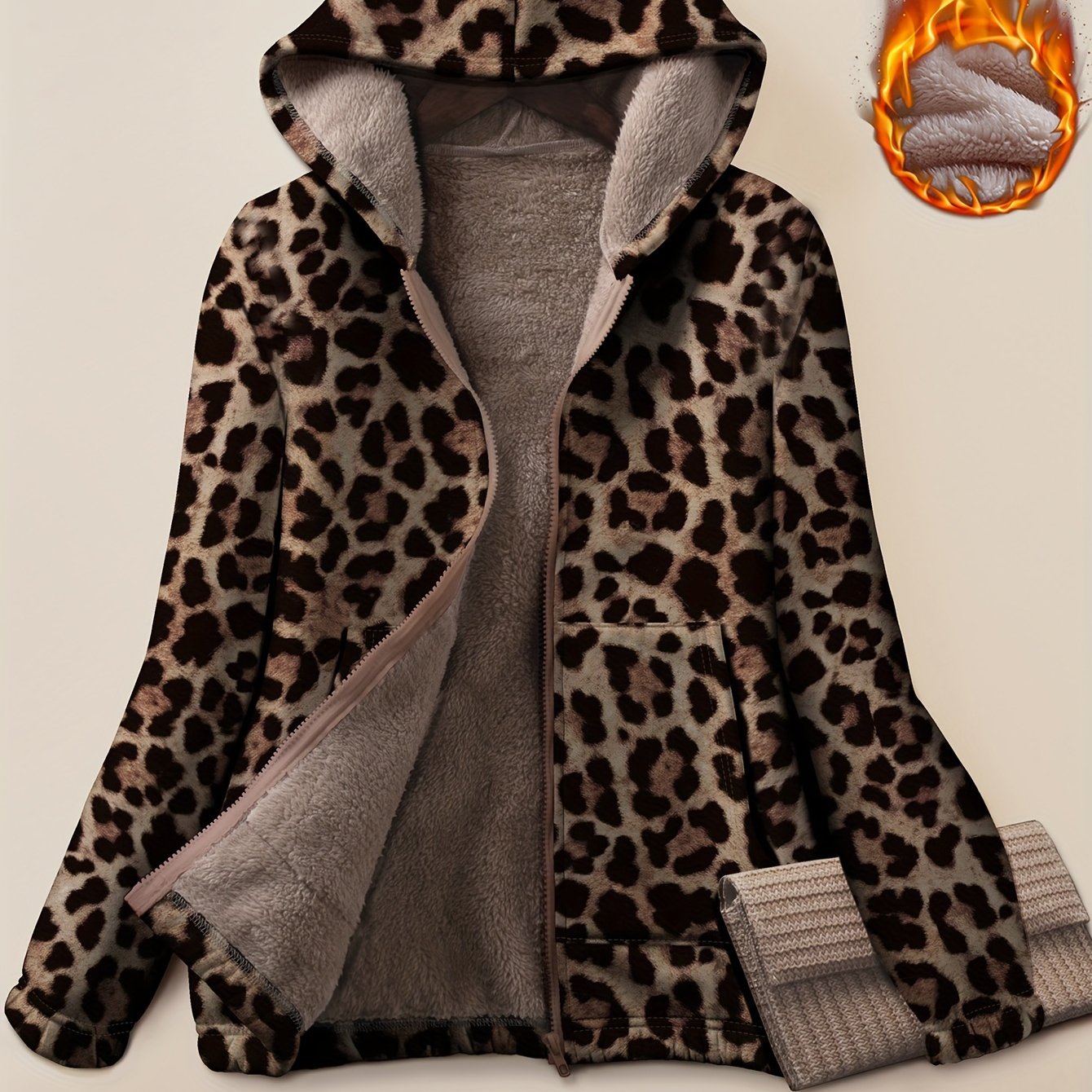 1pc Women'S Plus Size Casual Leopard Print Hooded Parka, Polyester Knit Fabric with Medium Stretch, Zippered Warm Comfortable Thick Jacket for Fall/Winter