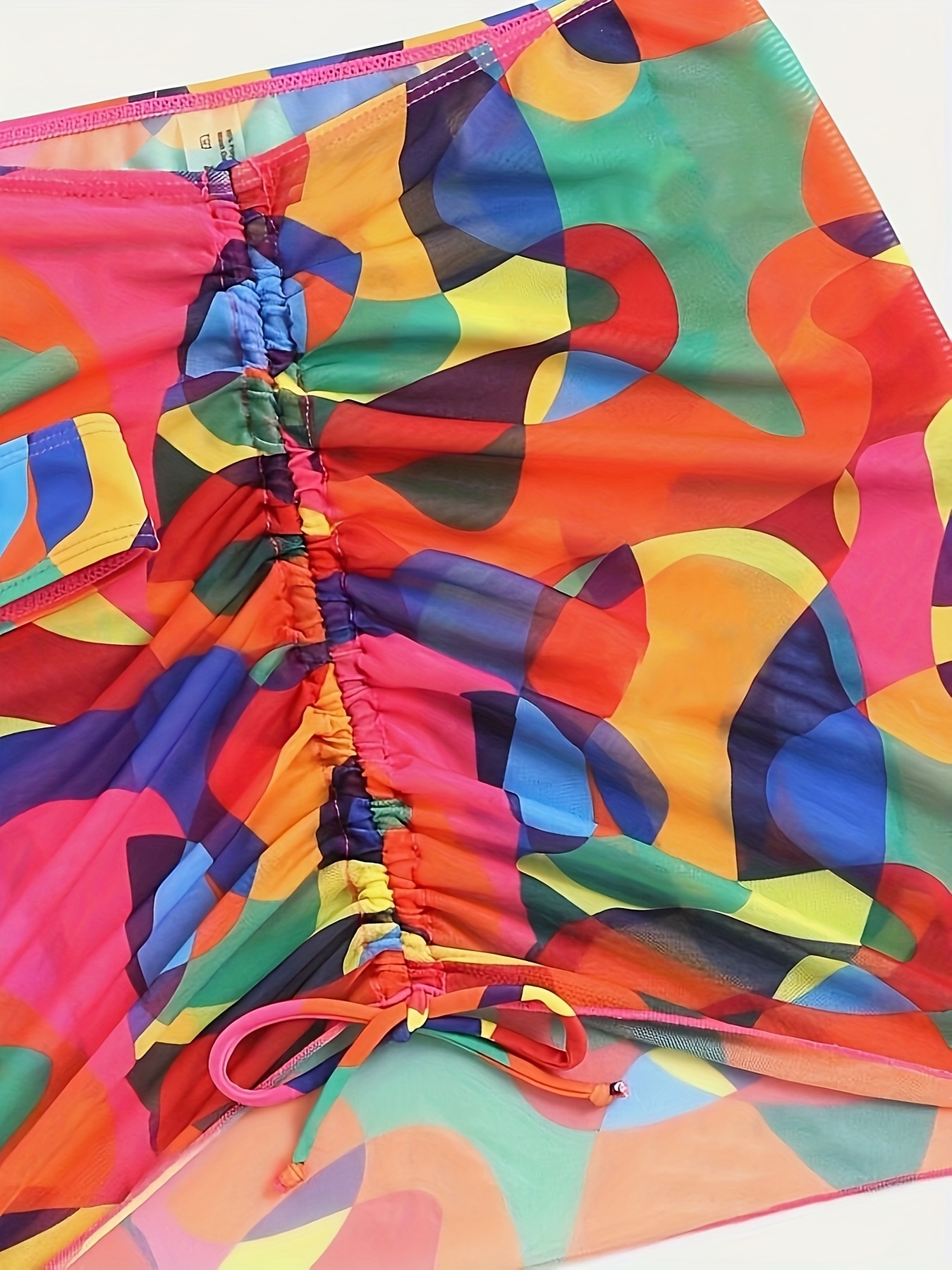 1set Women'S Geometric-Patterned Bikini Set, High Stretch Polyester Knit Fabric, 82% Polyester 18% Elastane, Colorful Printed Two-Piece Swimsuit with Lace-Up Detail