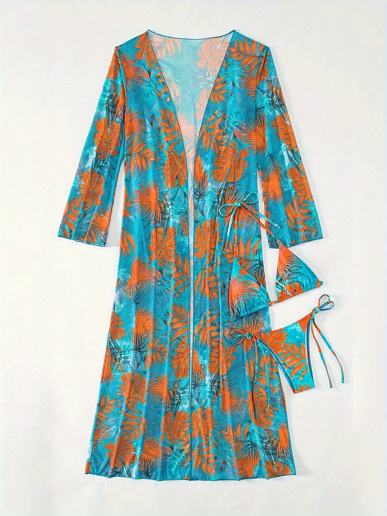 3 Piece Leaf Print Ruffled Tie Back Triangle Bikini Set - Stylish Women's Swimwear with Cover Up, Comfortable and Flattering Design - Perfect for Beach and Pool Time