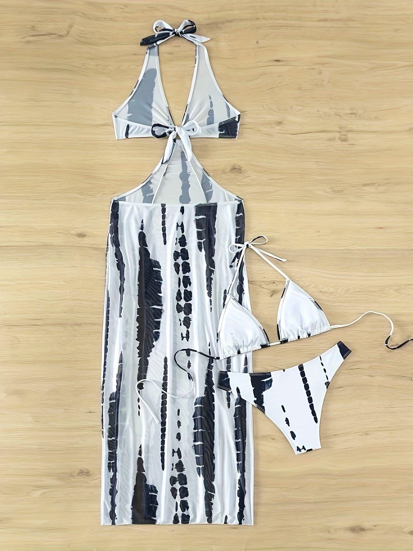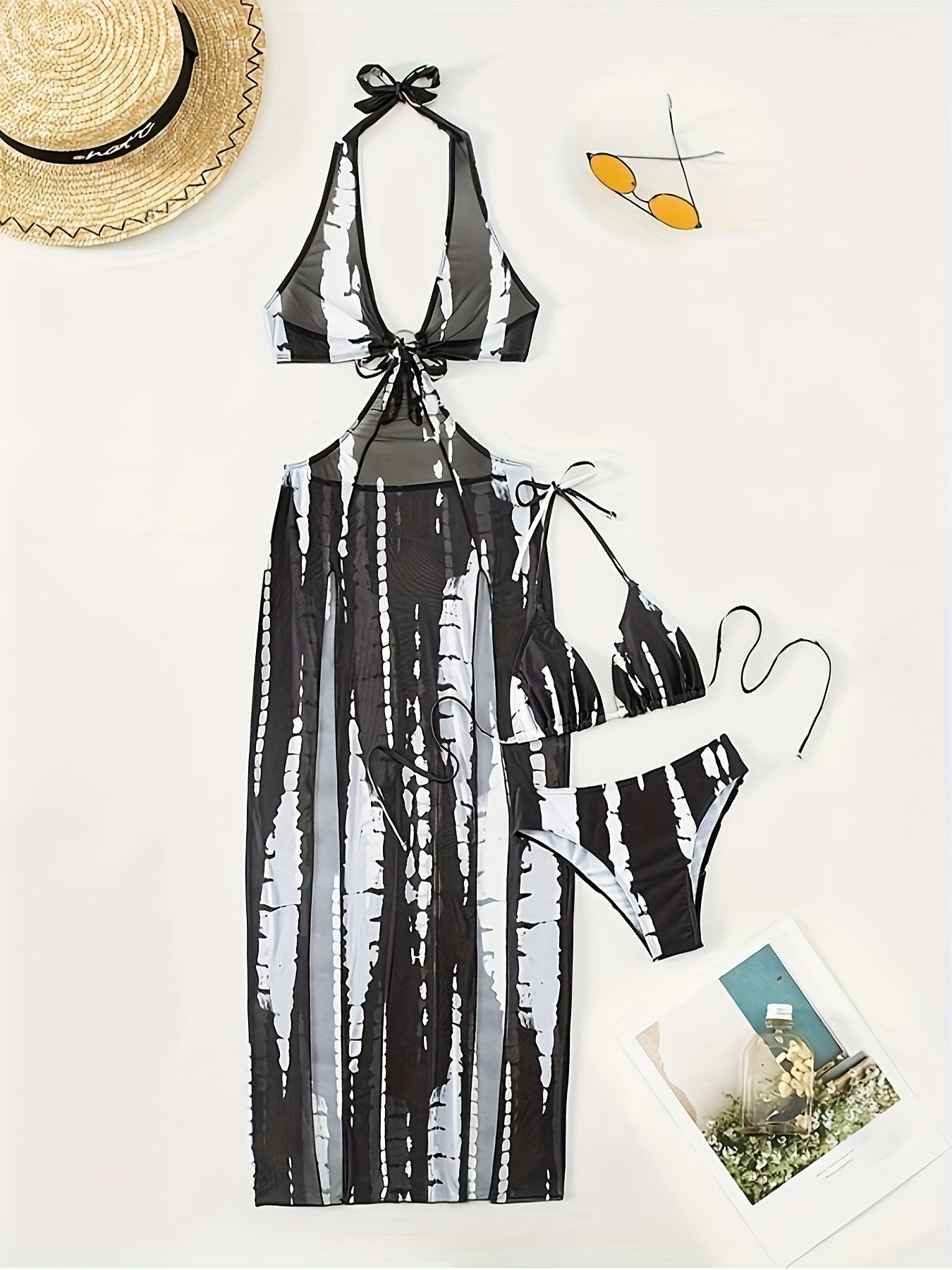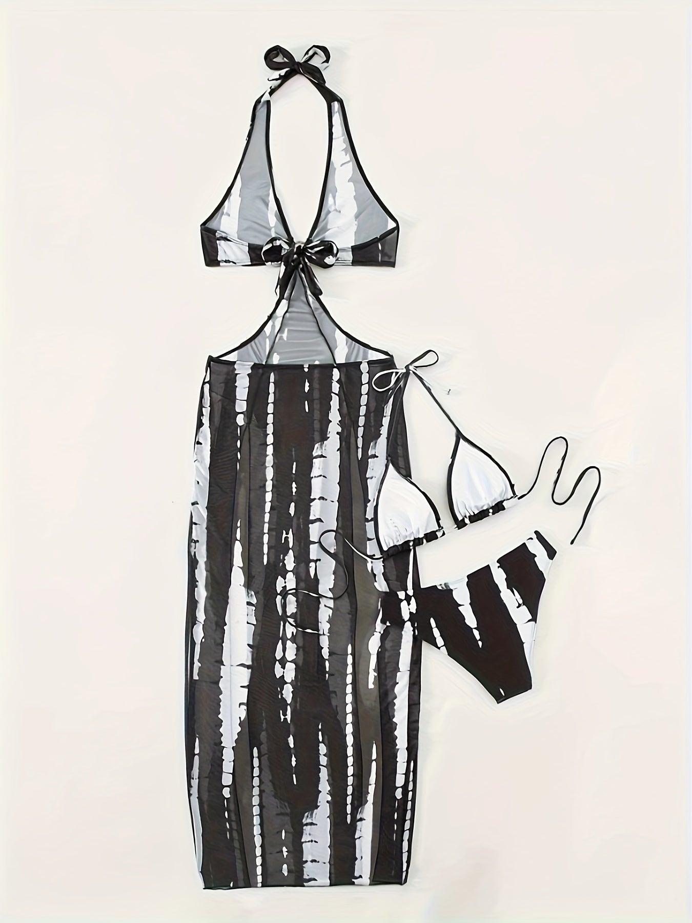 3 Piece Set Tie Dye Bikini - Halter Neck Triangle High Cut Swimsuit with Ring-Linked Mesh Cover-Up Dress - Women's Swimwear, Beachwear, and Vacation Clothing for Summer