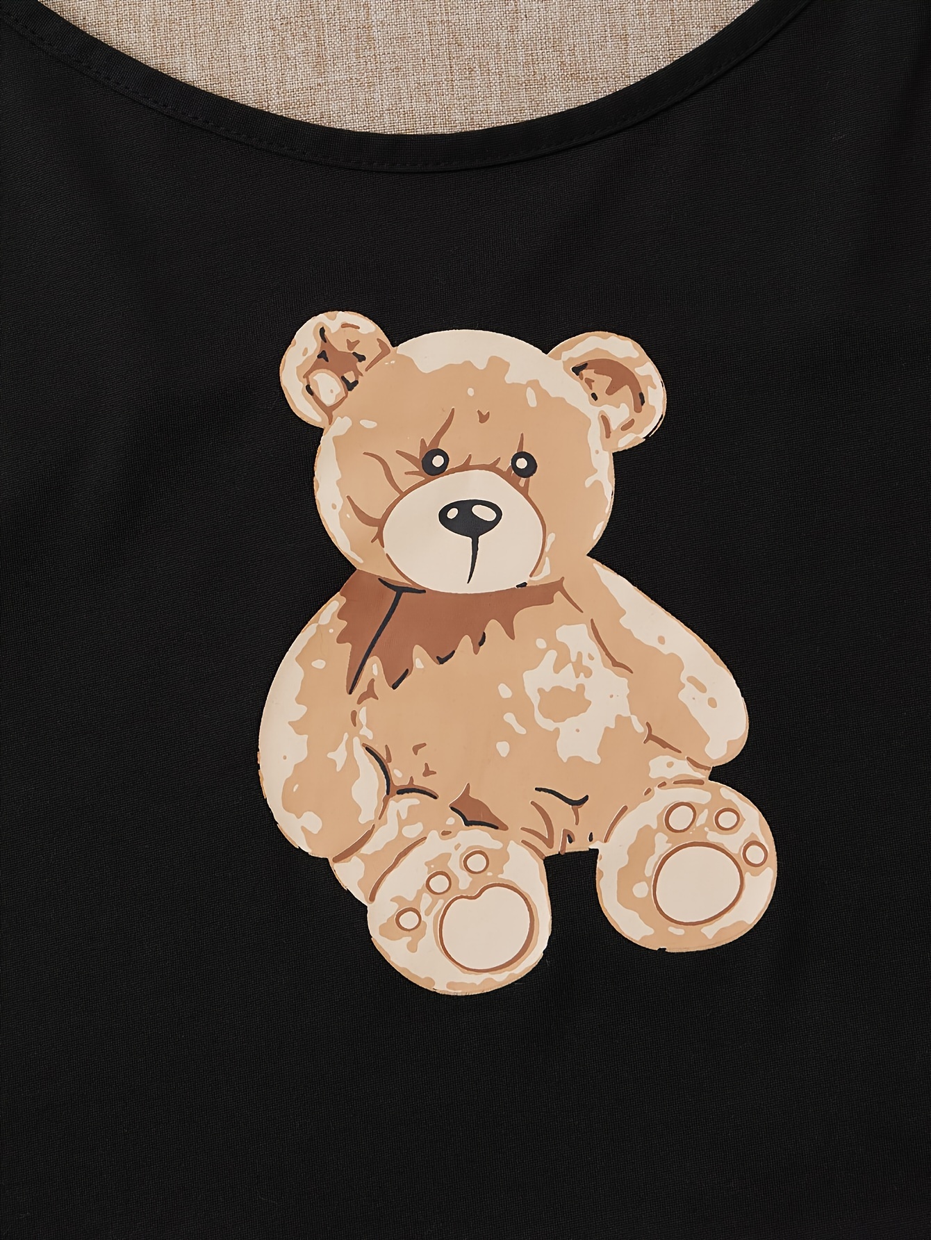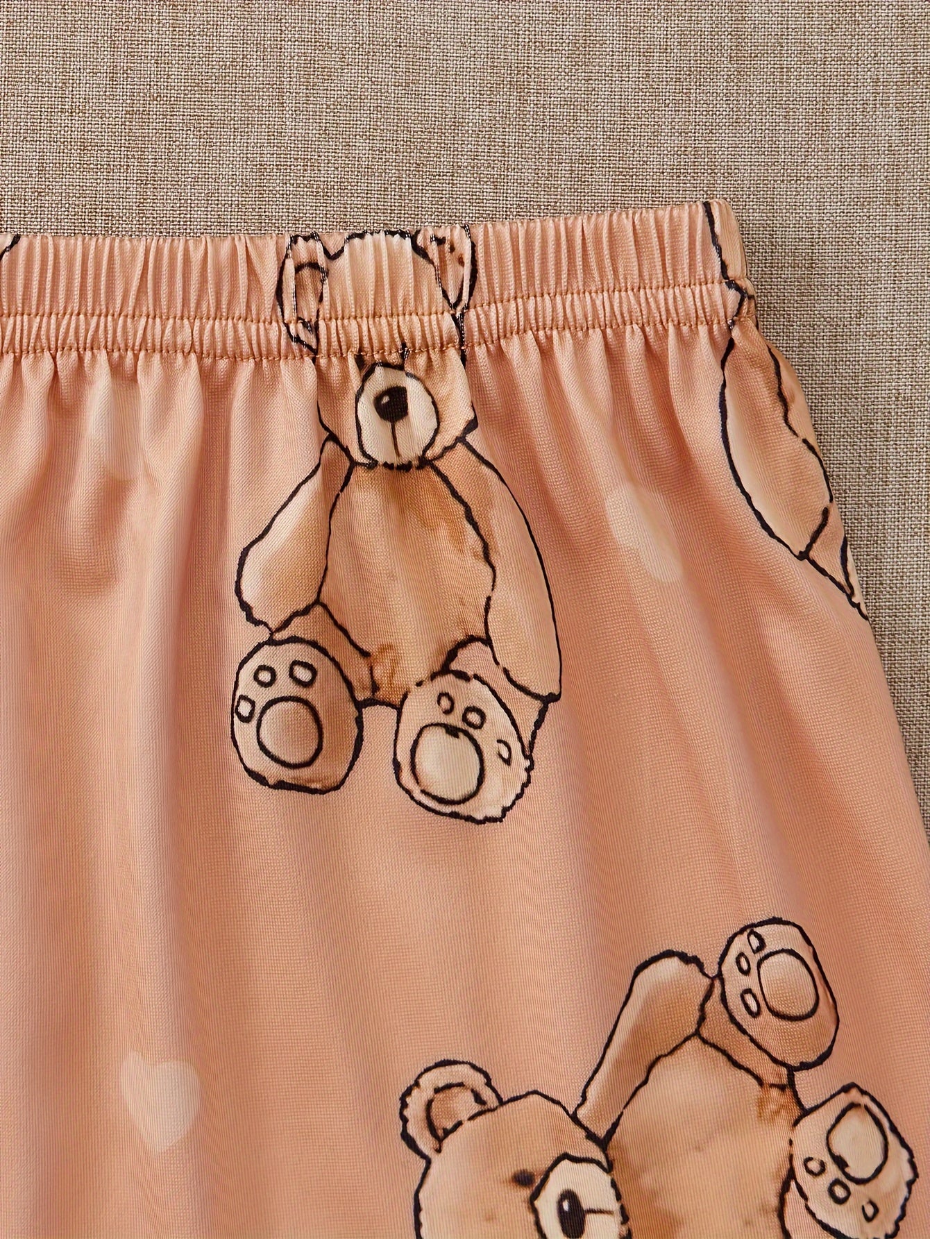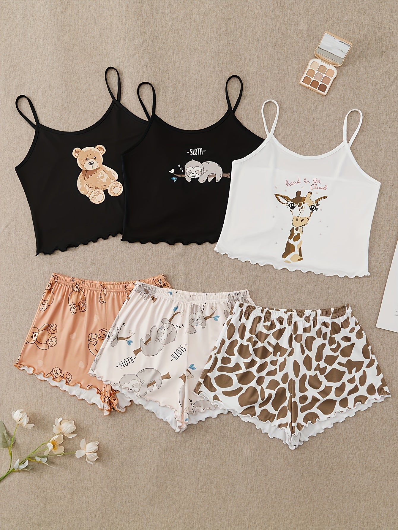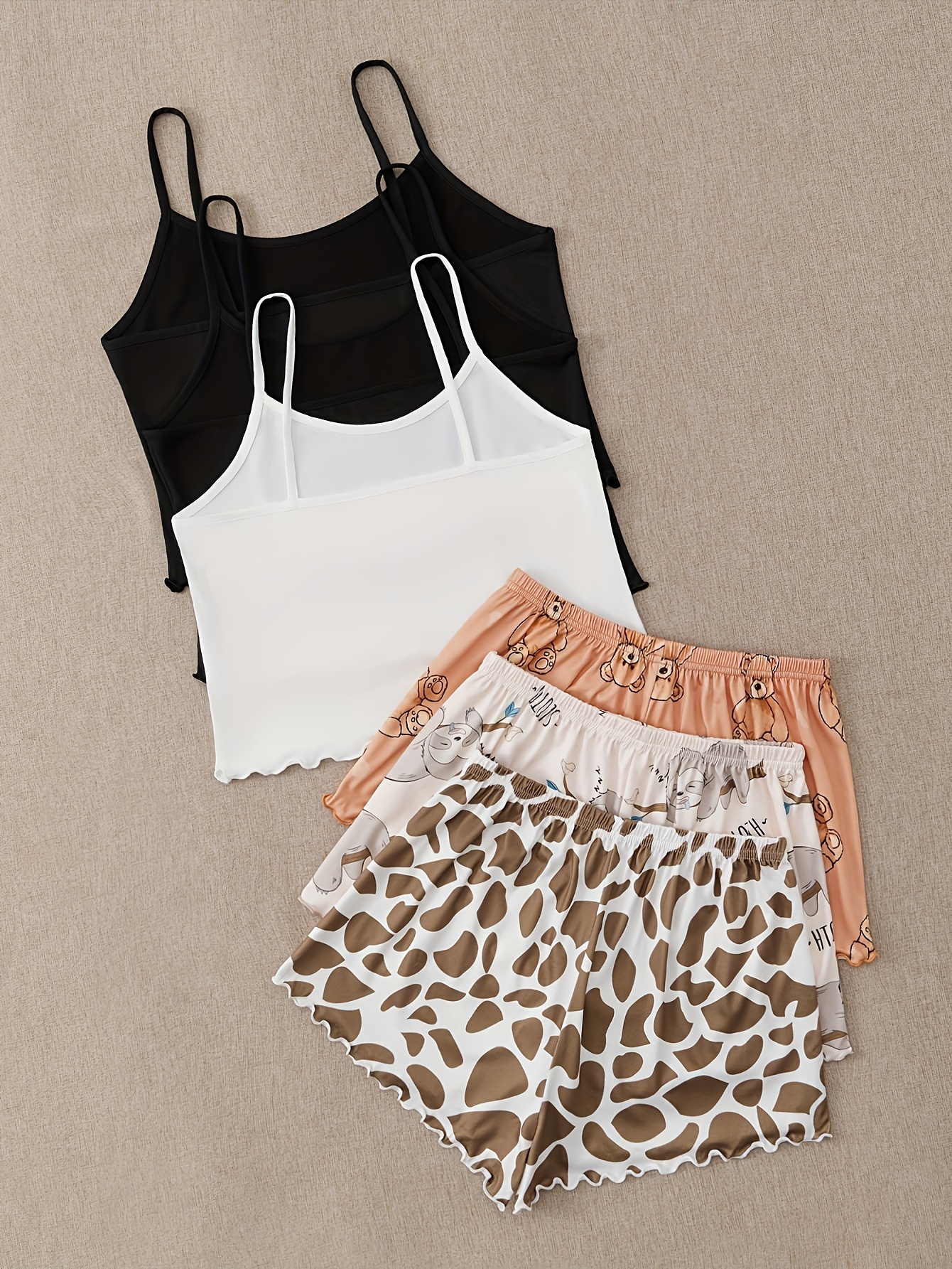 3 Sets Cartoon Print Pajama Set - Ultra-Relaxed Fit, Vibrant Print, Crew Neck Cami Top, Elastic Shorts - Womens Sleepwear & Loungewear with Lettuce Trim for Ultimate Comfort