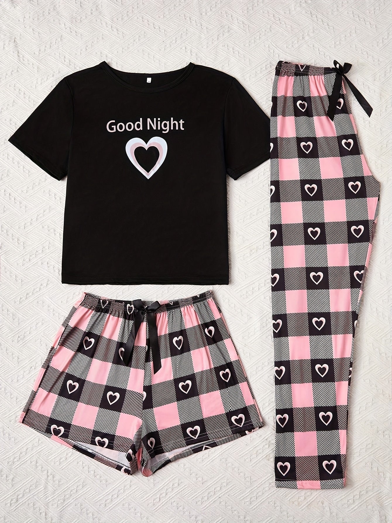 3pcs Women's Plaid Pajama Set - Comfortable Polyester Knit, Crew Neck, Short Sleeve Top with Cropped Pants and Shorts for All-Season Sleepwear