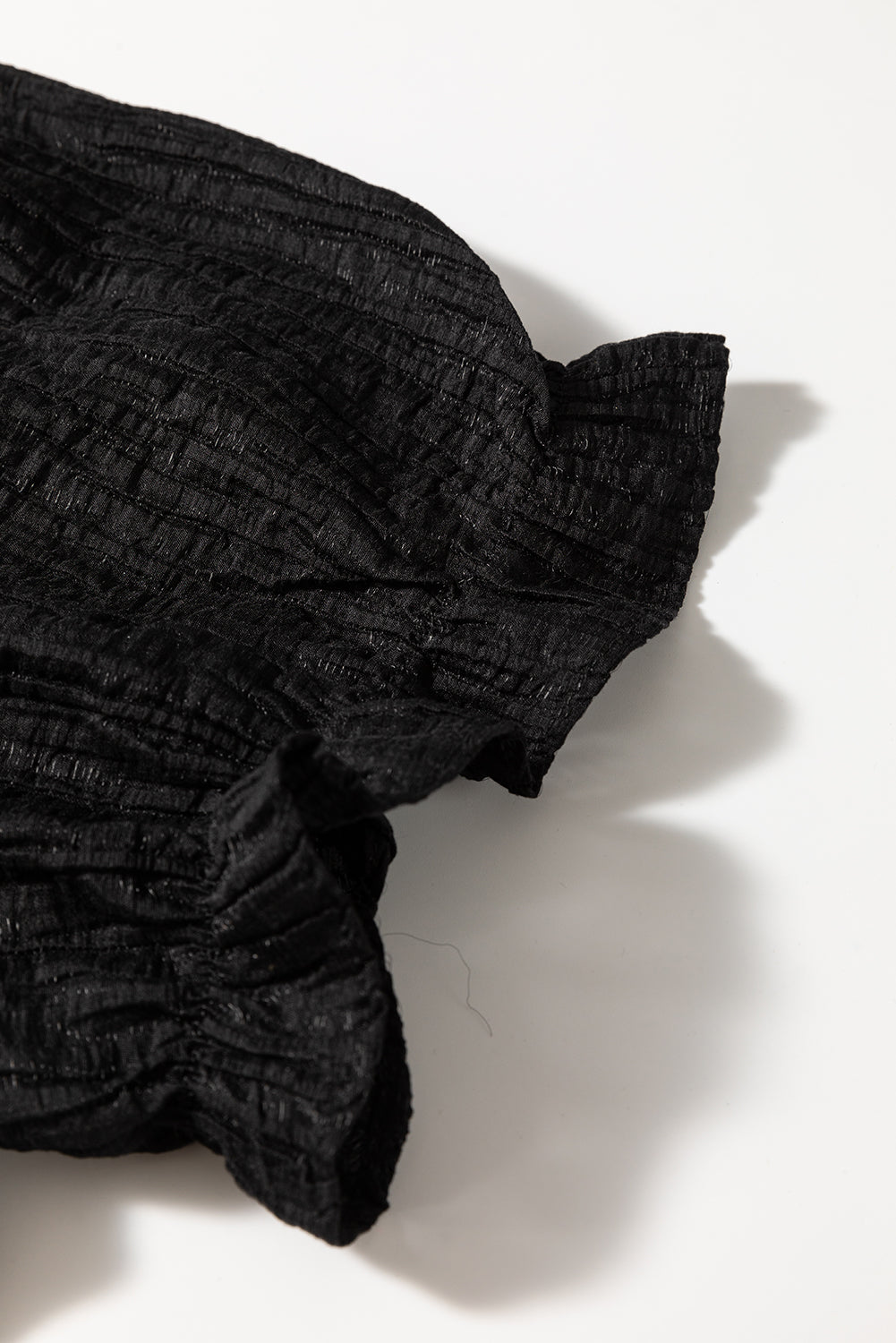 - Ruffled puff sleeves accentuate a feminine silhouette to the ensemble.