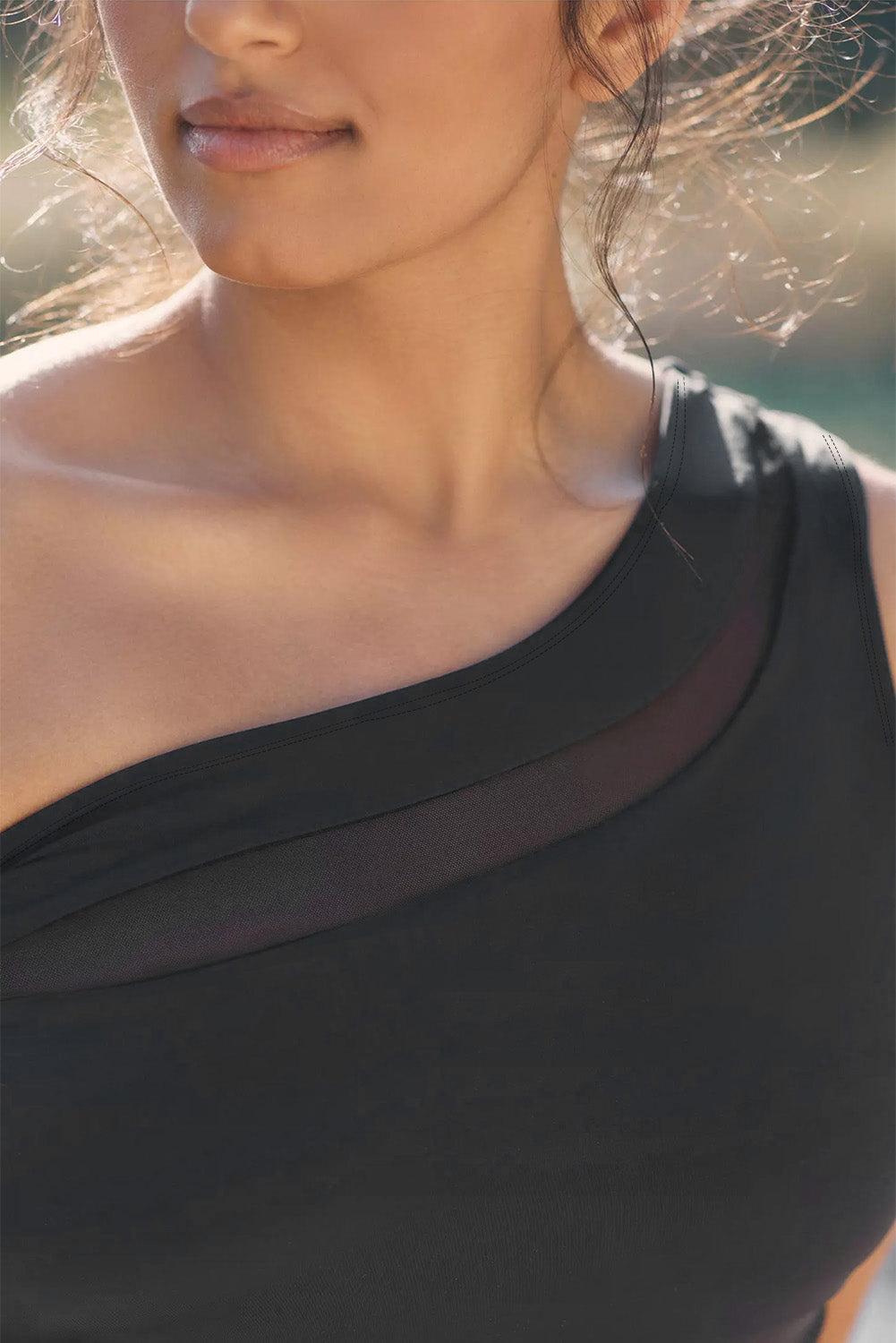 - The one shoulder design and mesh insert add a touch of sophistication and sexiness