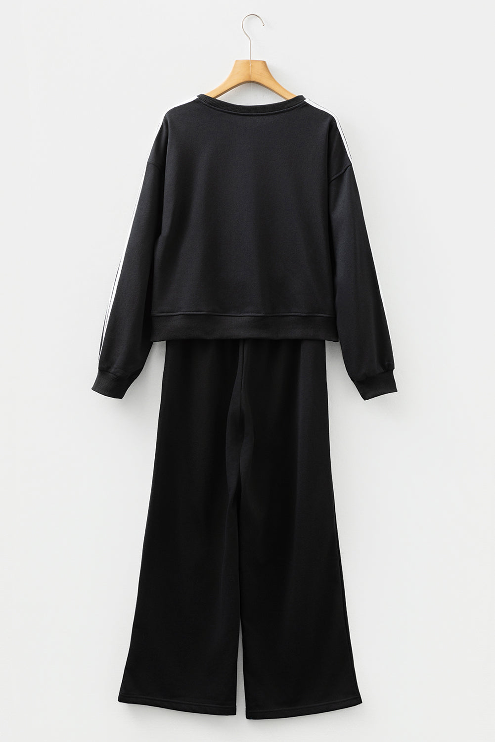Black Varsity Striped Detail Crewneck Pullover Elastic Sweatpants 2pcs Outfit