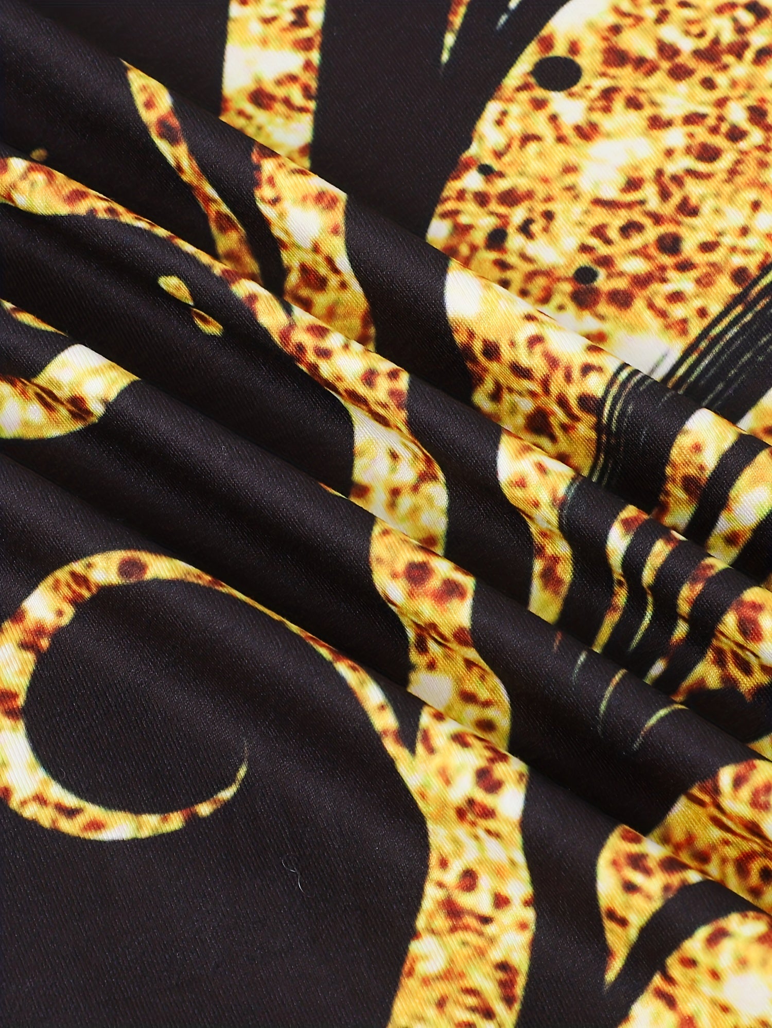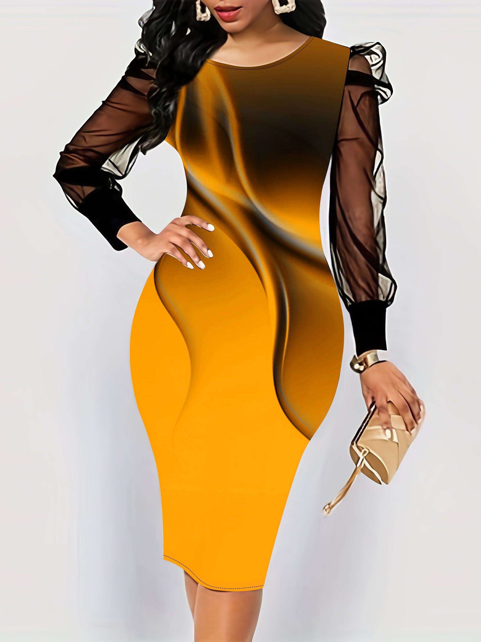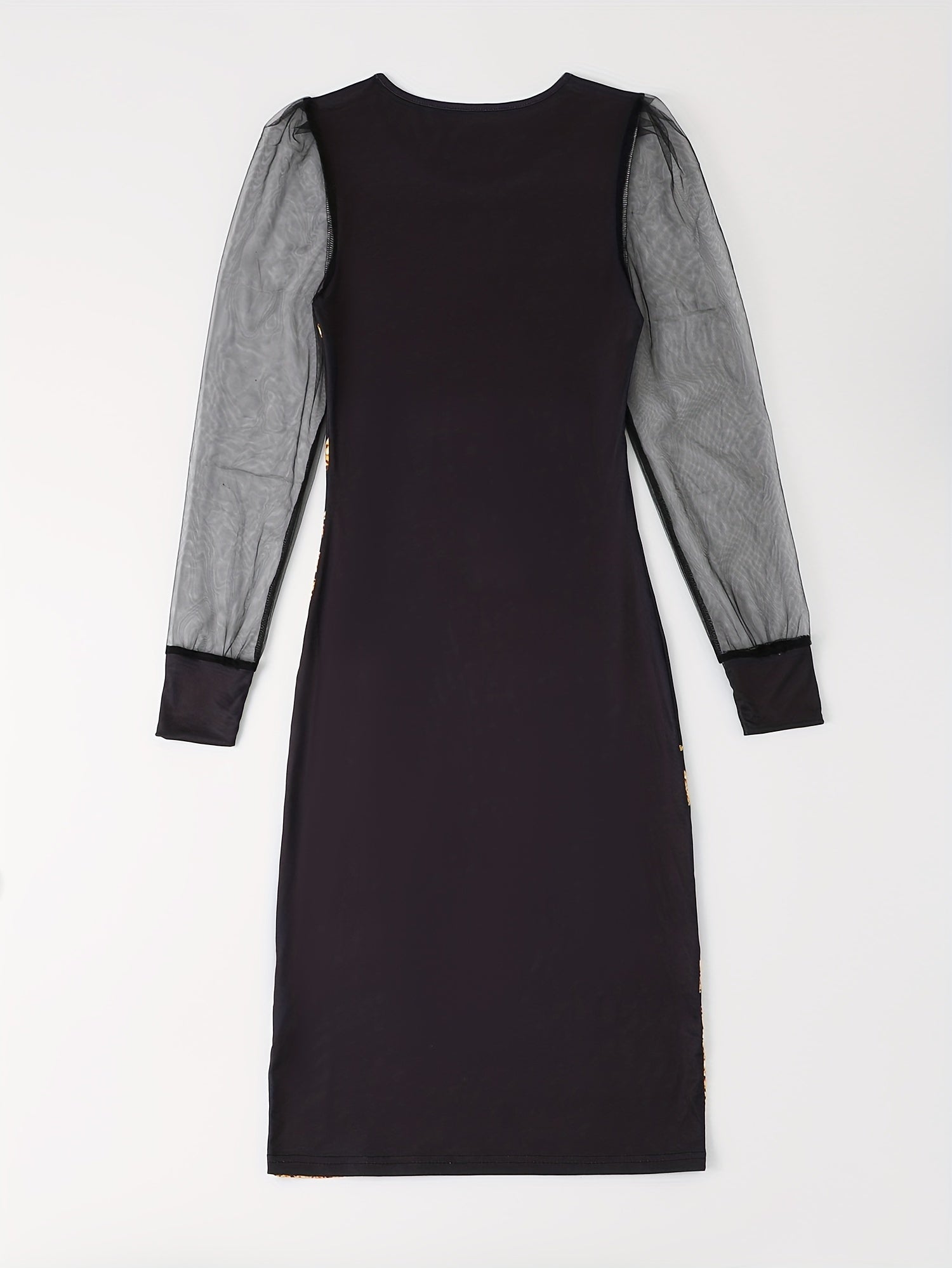 Butterfly Print Contrast Mesh Dress, Elegant Crew Neck Long Sleeve Dress, Women's Clothing