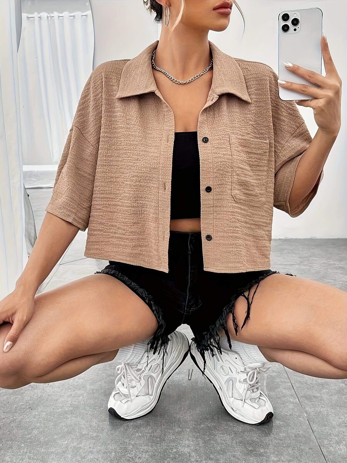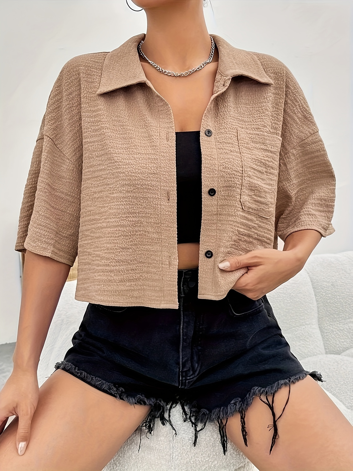 Button Front Crop Blouse, Casual Short Sleeve Blouse For Spring & Summer, Women's Clothing