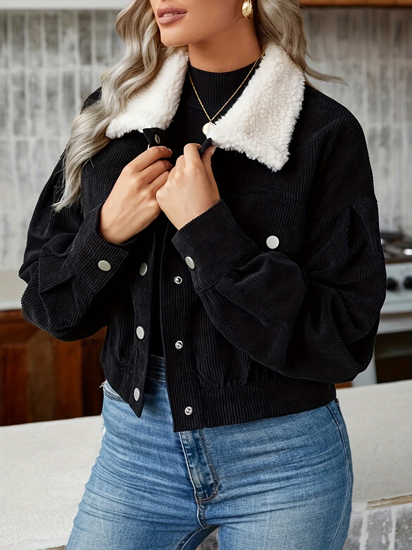 Button Front Fuzzy Lapel Jacket, Casual Long Sleeve Crop Jacket For Fall & Winter, Women's Clothing