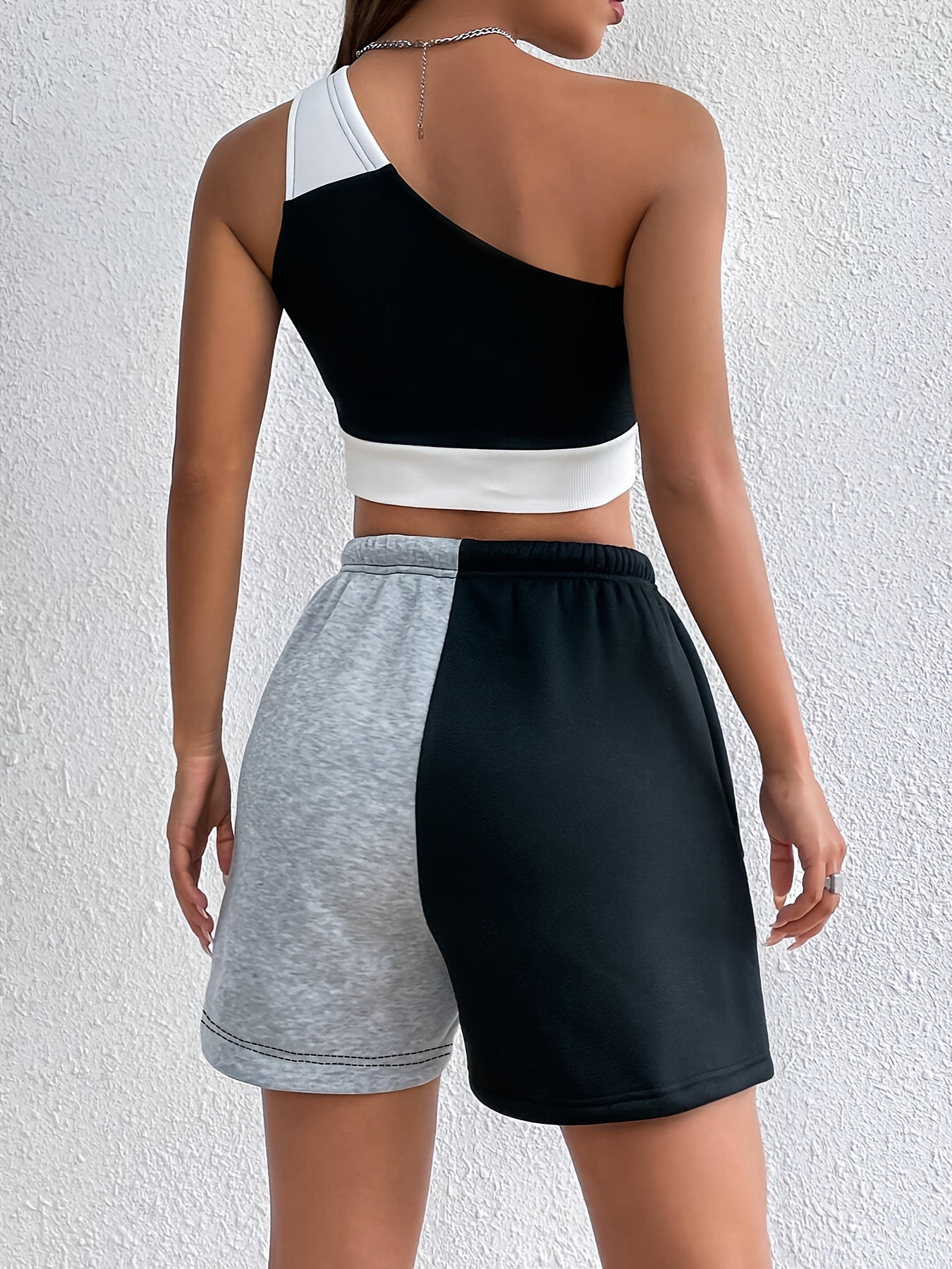 Casual Style, Color-Blocked One-Shoulder Crop Top And Drawstring Shorts.