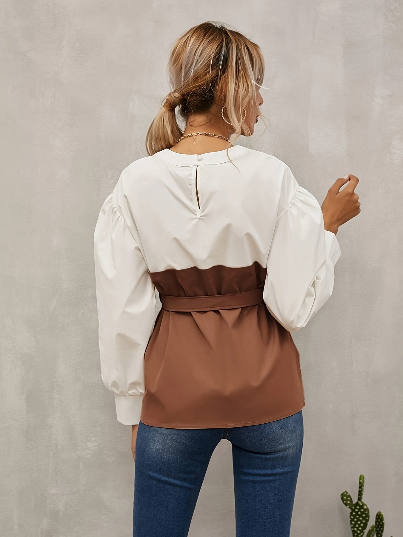 Chic Color Block Long Sleeve Blouse for Women - Polyester, Machine Washable, Non-Sheer - Perfect for Spring & Fall