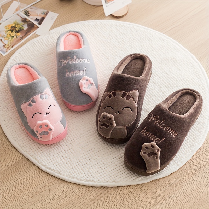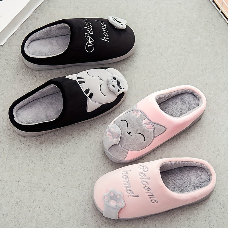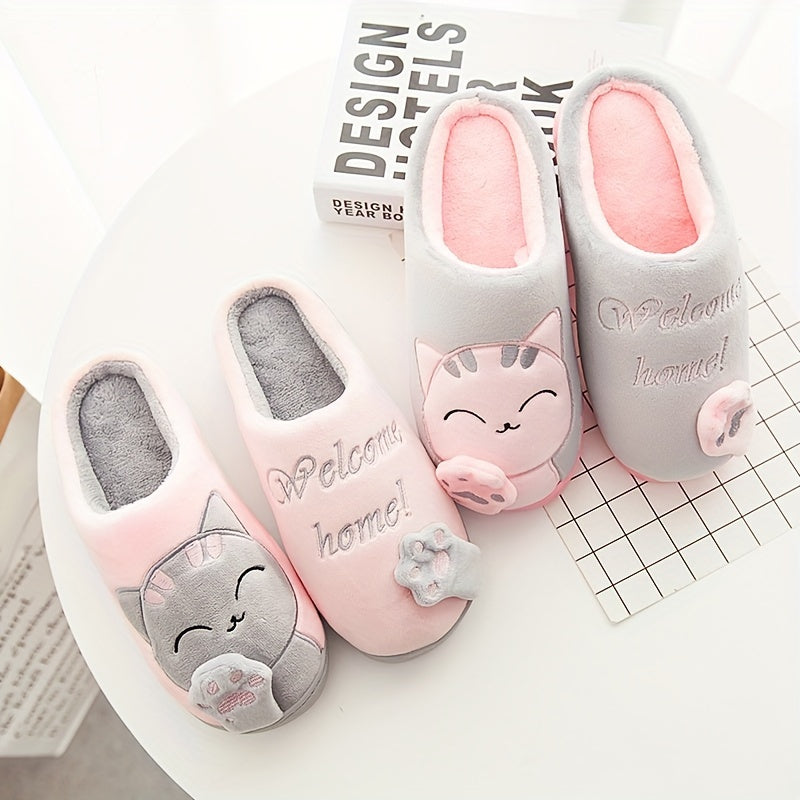 Cozy Plush-Lined Cat Claw Slippers for Men and Women - Cute Cartoon Design, "Welcome HOME" Embroidery, Warm & Comfortable Indoor Footwear with Anti-Skid TPR Sole, Perfect for Bedroom Use - Available in Black, Pink, and Gray
