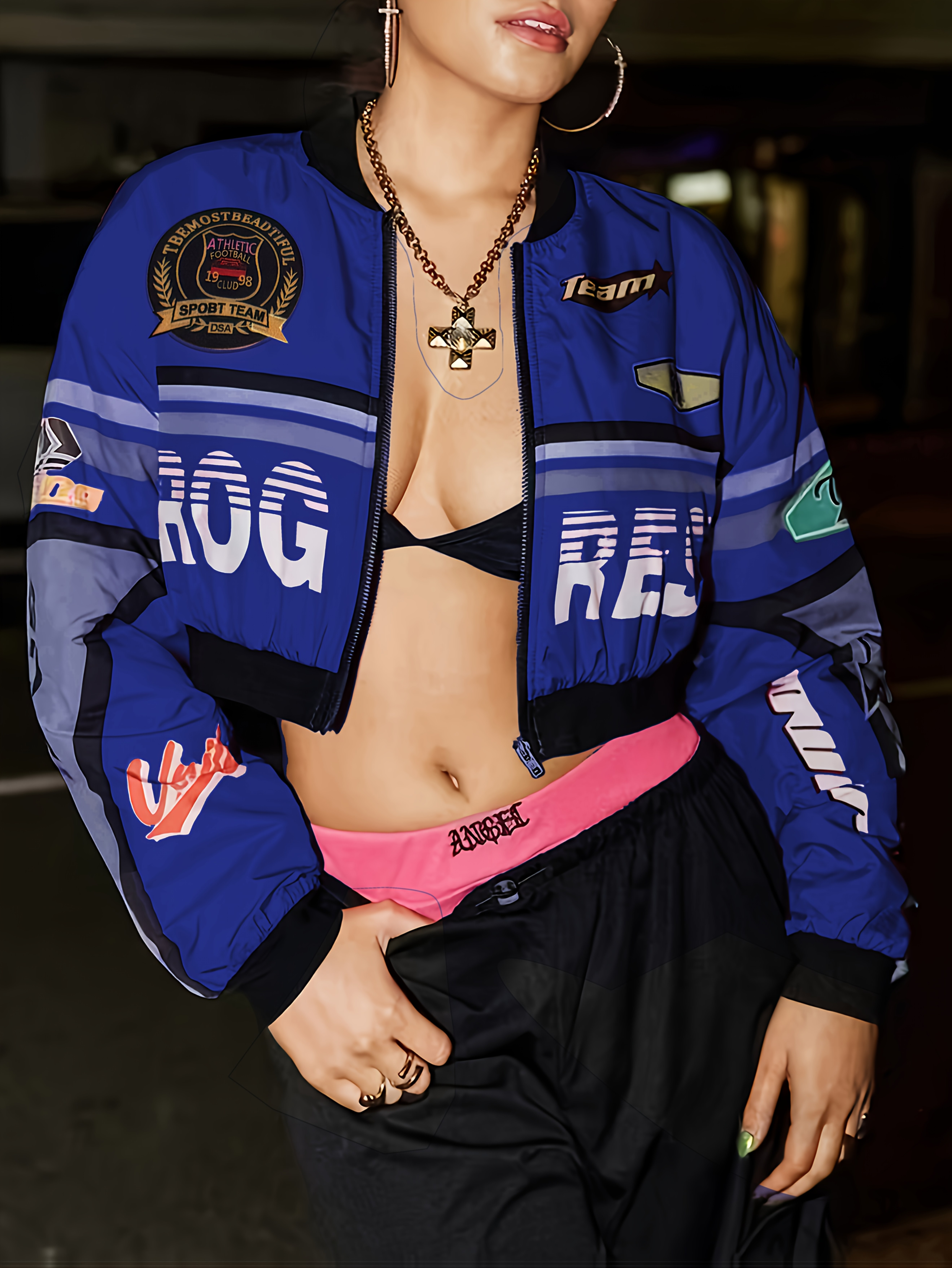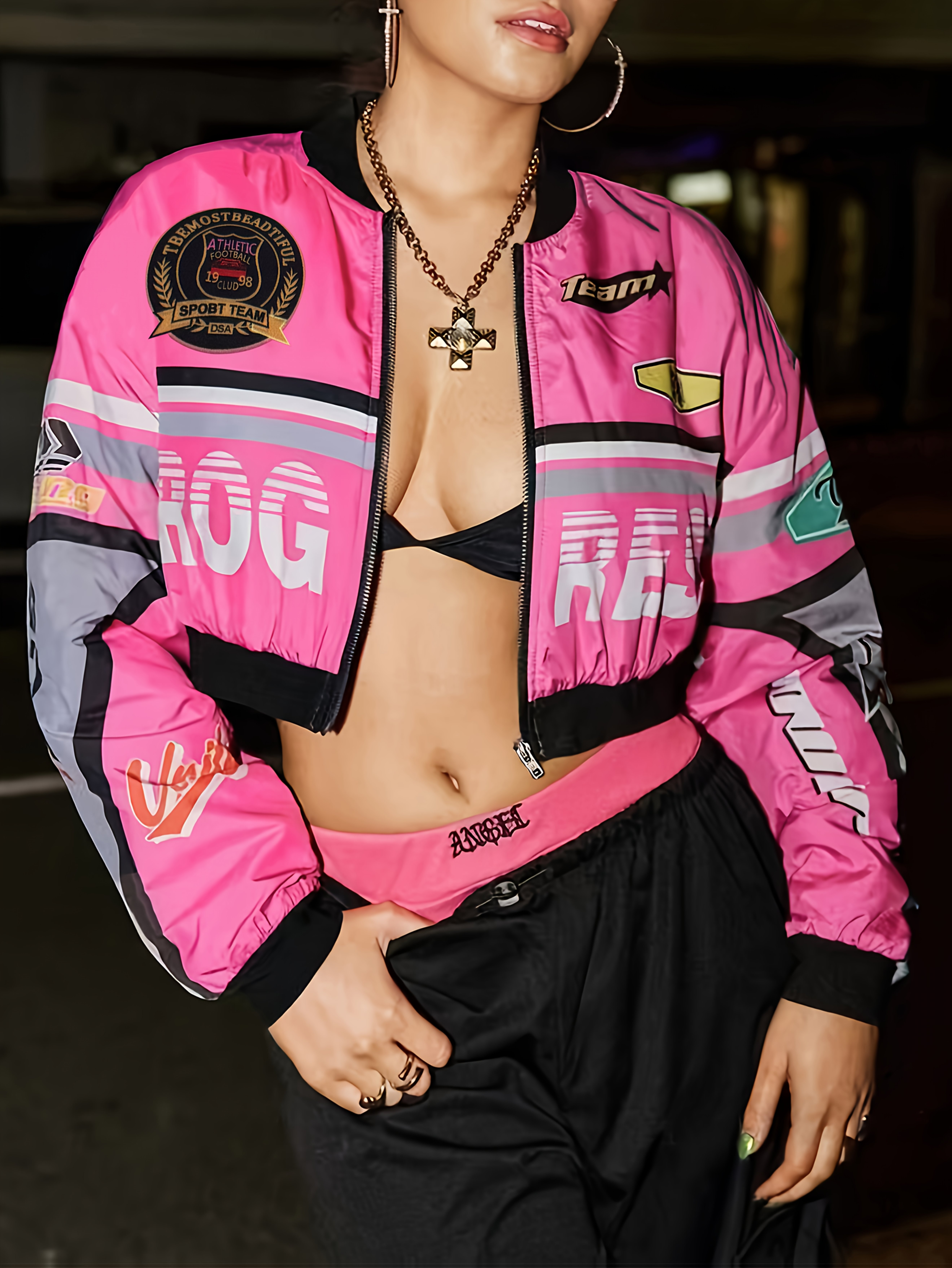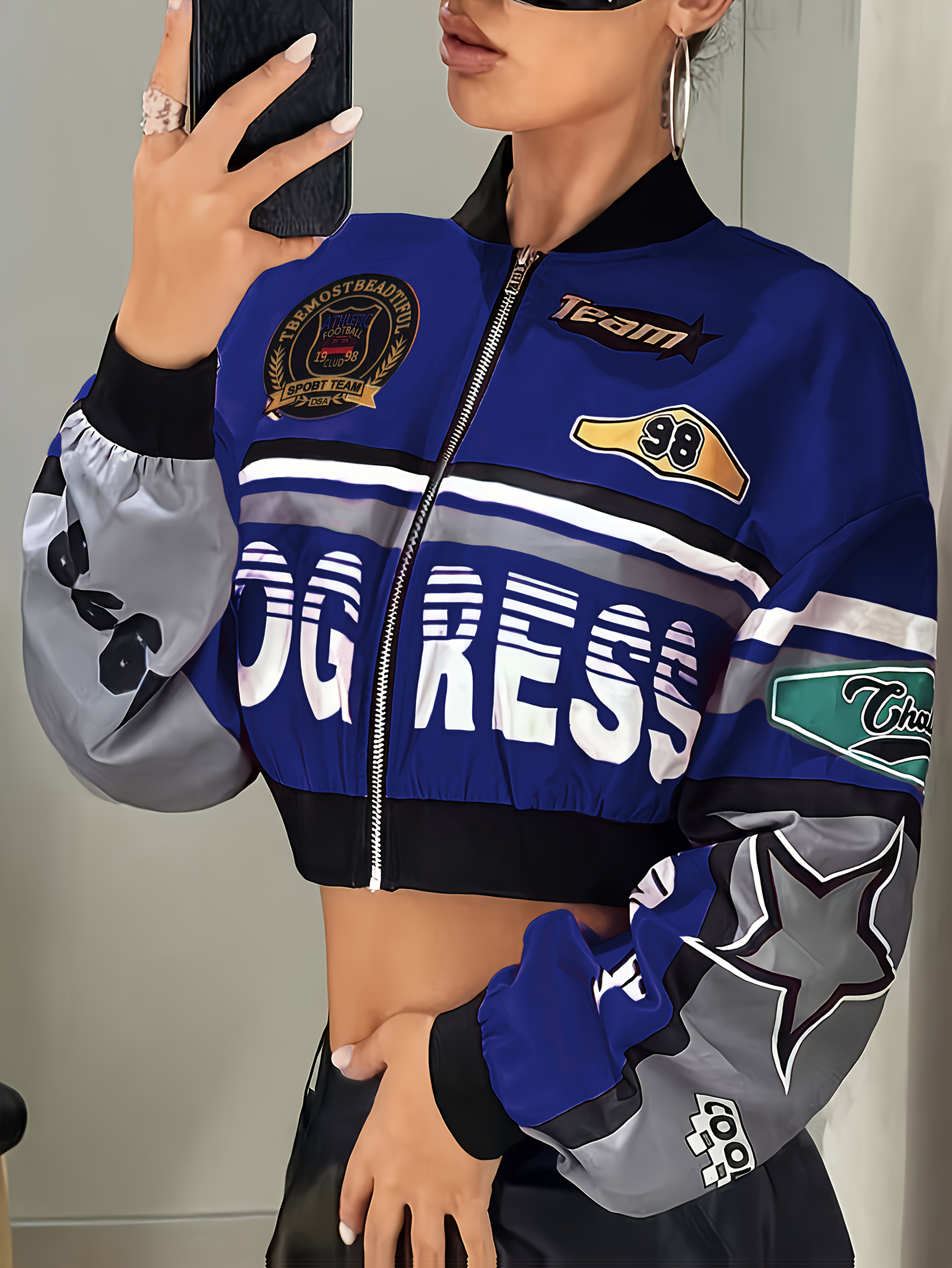 Elegant Color-Block Motorcycle Jacket for Women - Loose Fit, Slimming Baseball Style, Polyester, Machine Washable, Middle East Special Project Style, ALL/Global/All