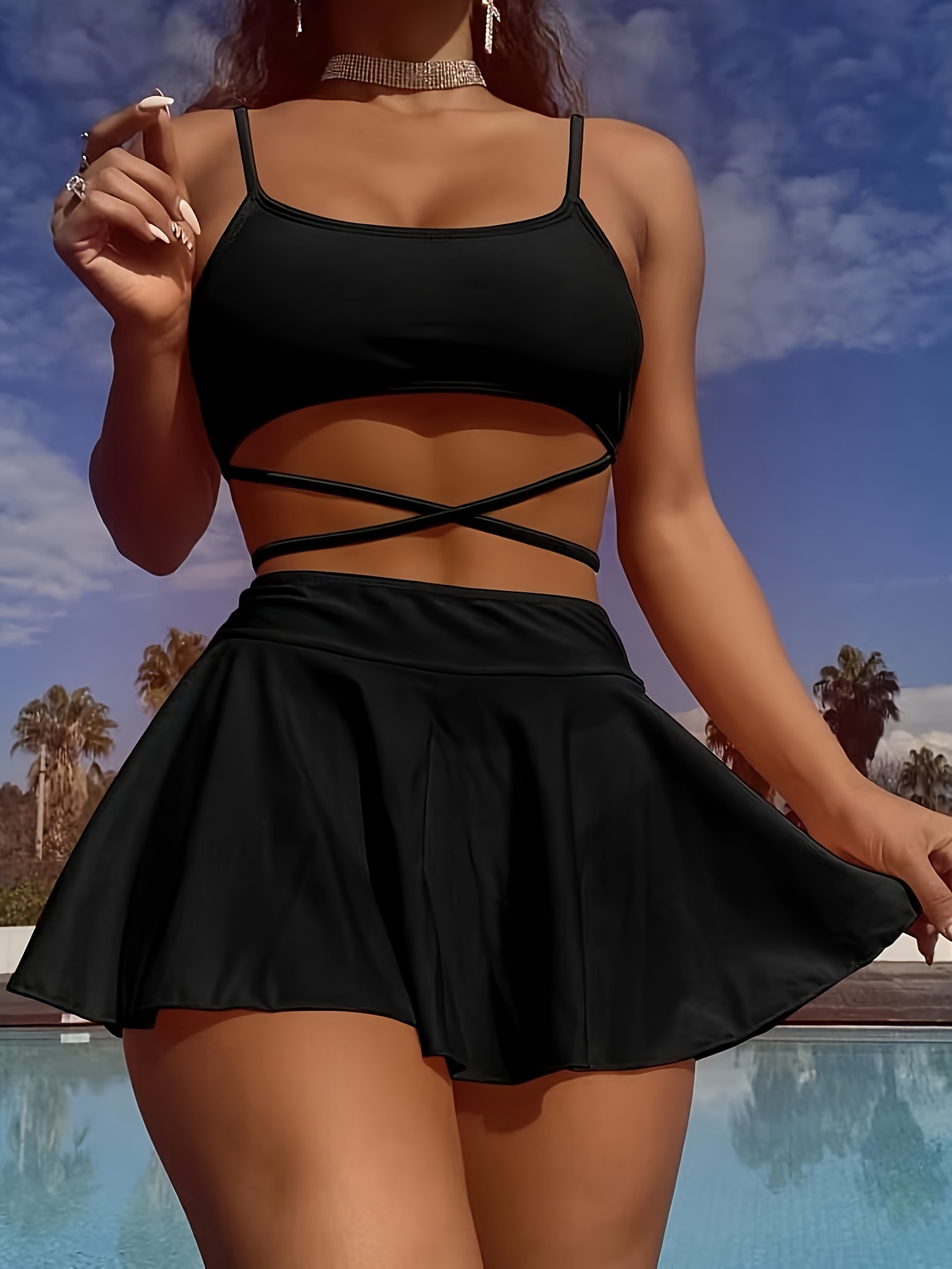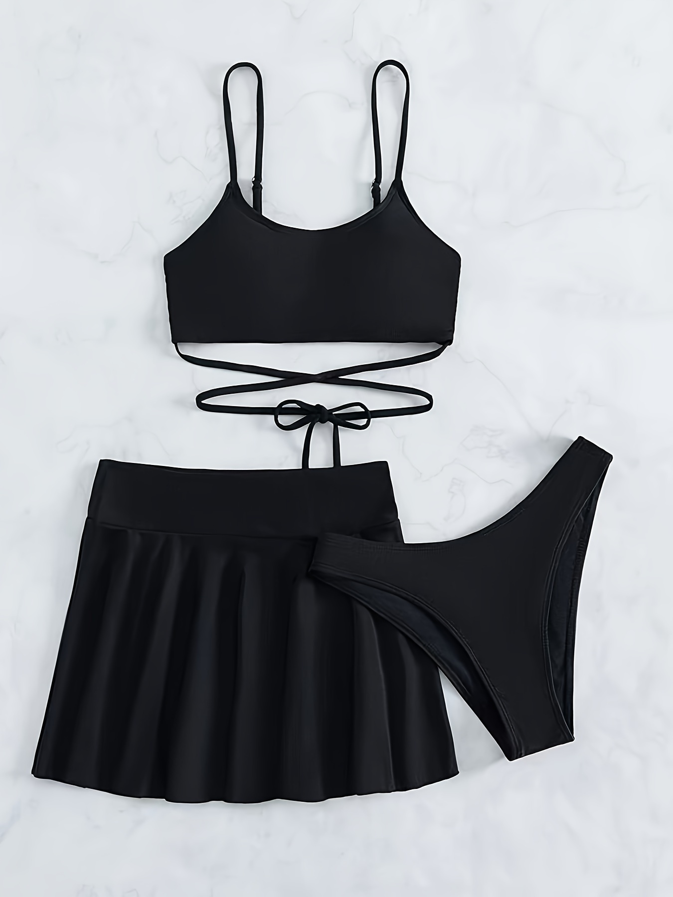 Elegant Solid-Color 3-Piece Swimwear: Cross-Strap Bikini & Pleated Skirt Cover-Up - Comfortable, Stretchy, and Durable