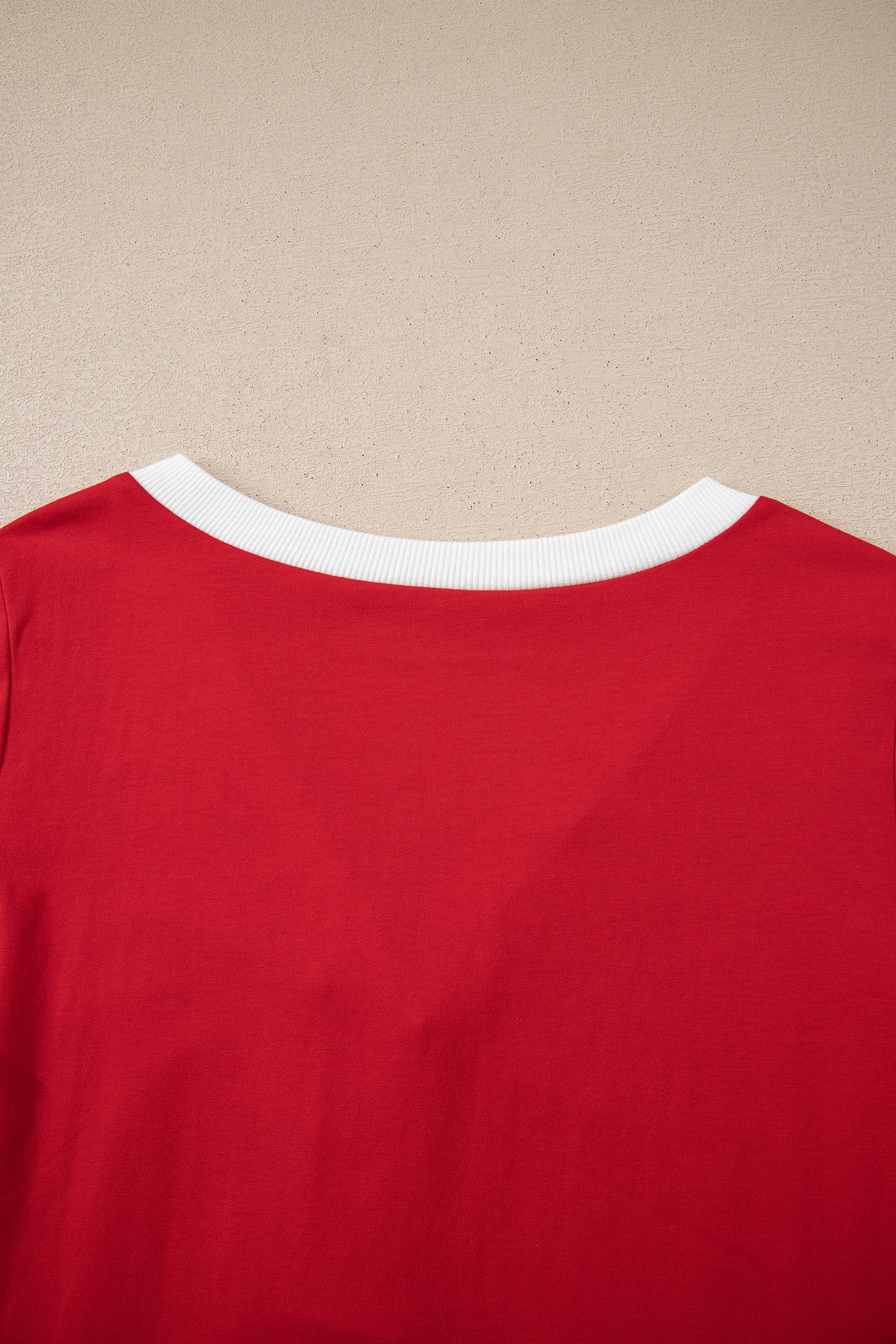 Fiery Red Contrast Trim Button V Neck Ribbon Bow Knot Waist 2pcs Lounge Pant Set