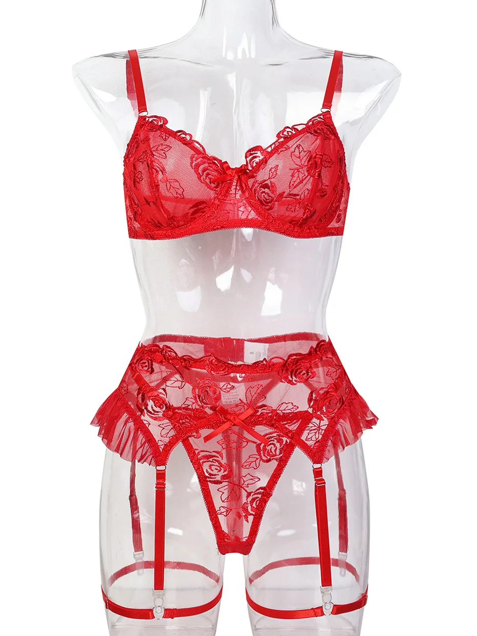 JSY Sexy Lingerie Women Underwear Set Red Embroidery Lace Bra And Pant Garter Set Skirt Babydoll Erotic Brief Set Porno Costume