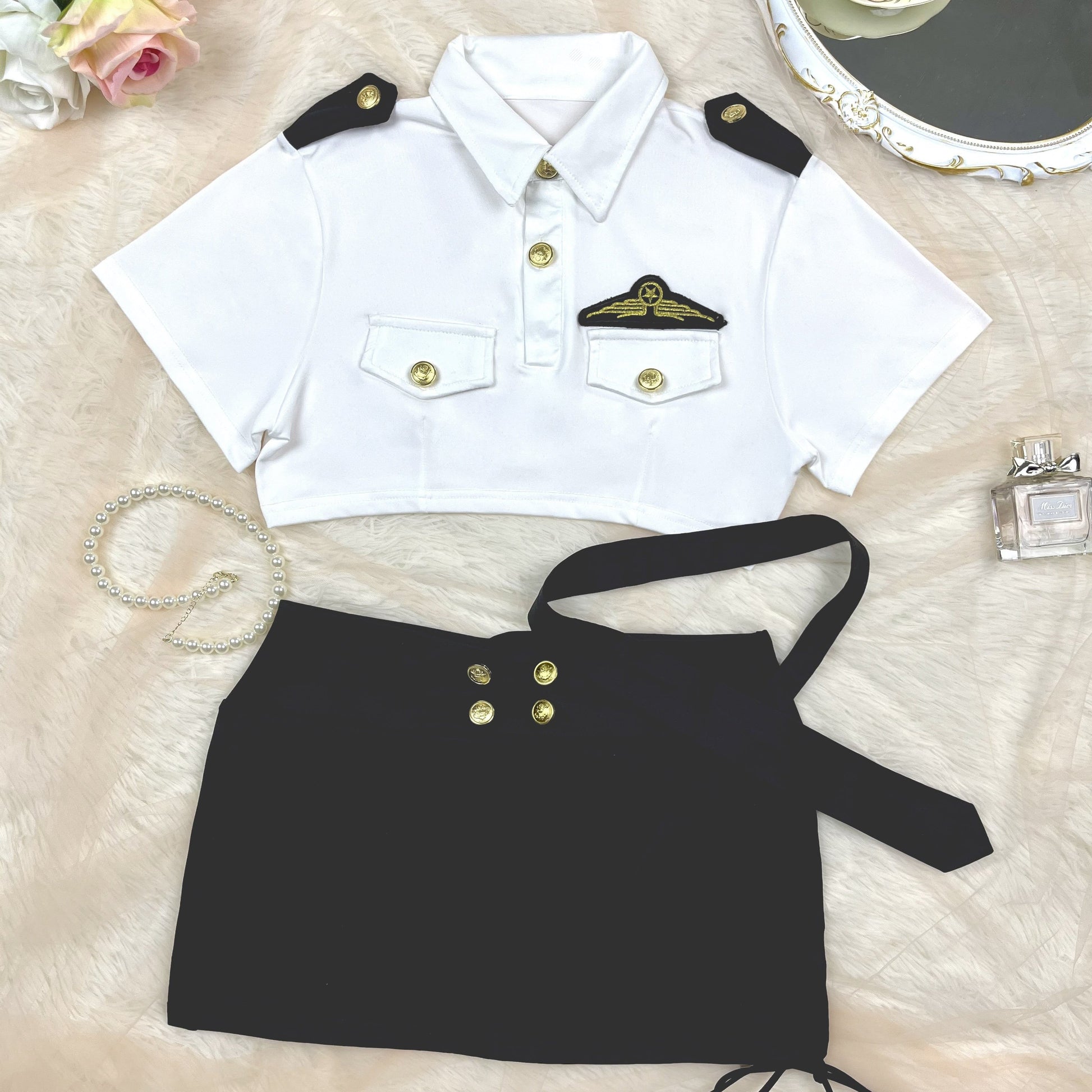 Naughty Policewoman Cosplay Costume, Short Sleeve Buttons Lapel Collar Crop Top & Side Tie Ruched Mini Skirt, Women's Sexy Lingerie & Underwear
