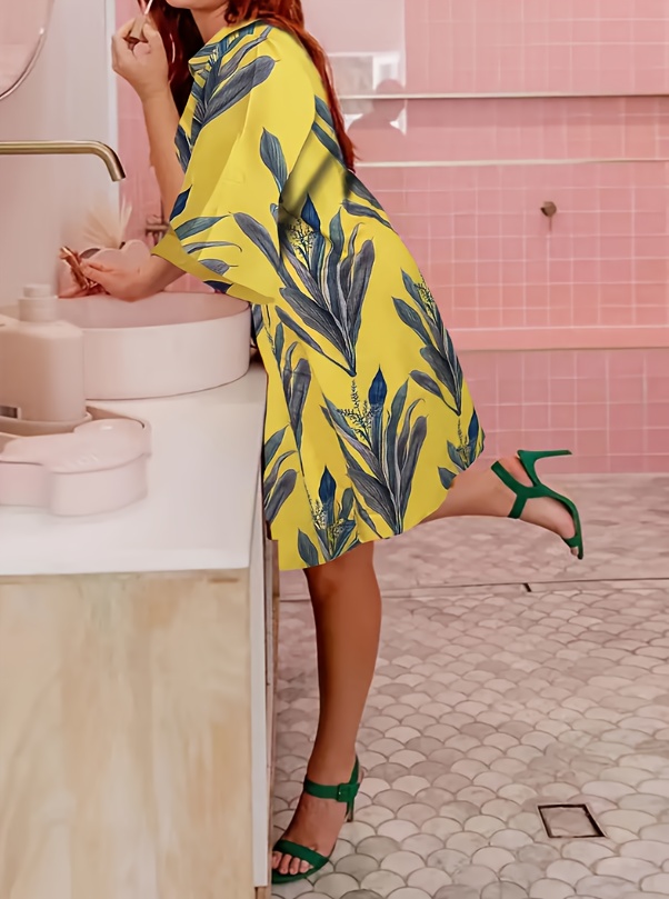 Plant Print Button Front Dress, Casual Long Sleeve Midi Dress, Women's Clothing