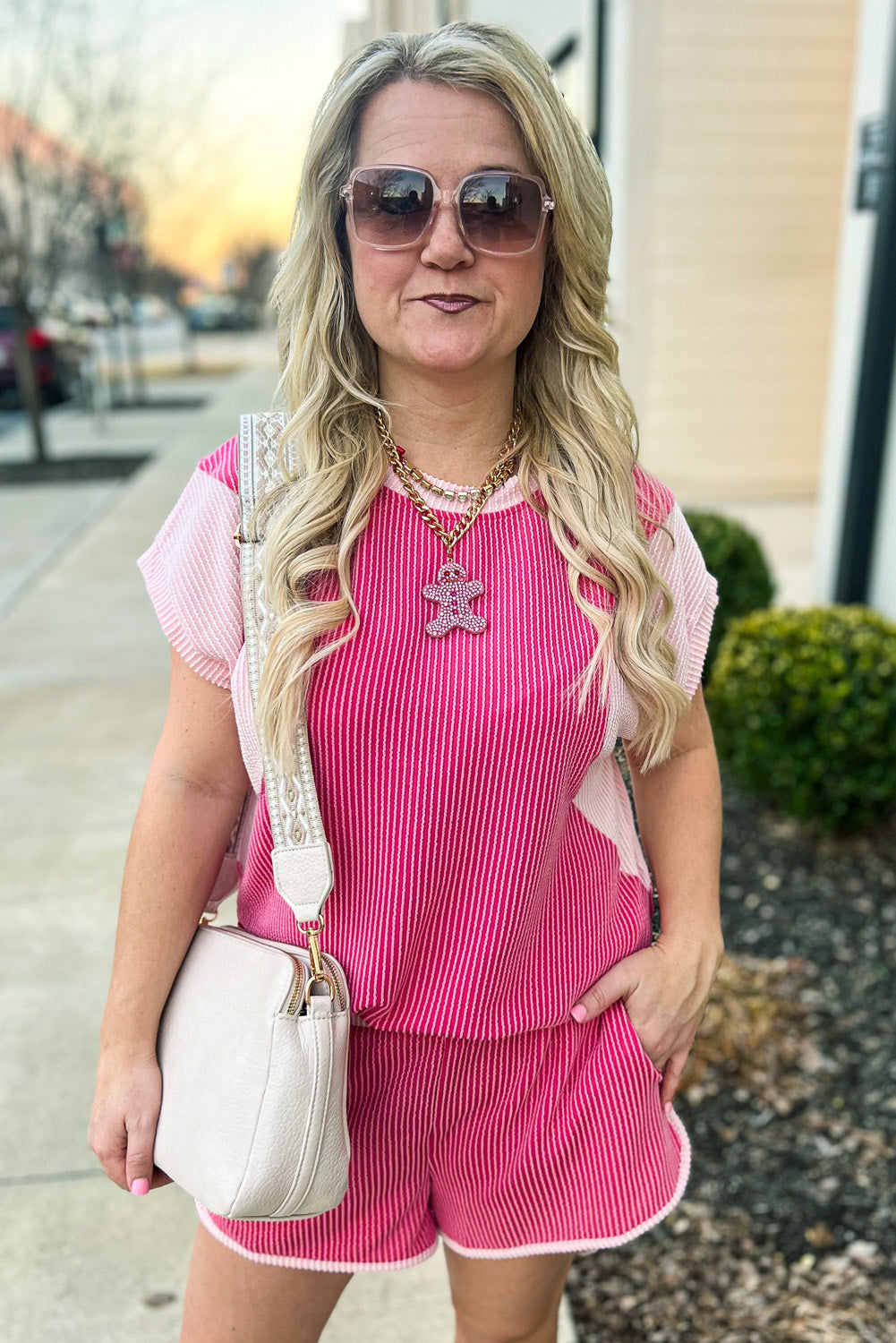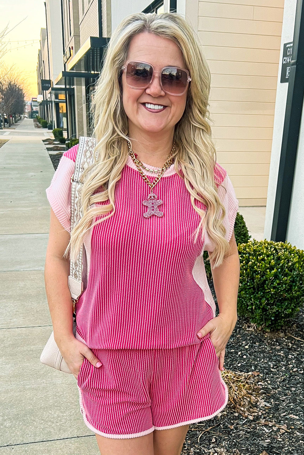 Rose Red 3D Spiral Ribbed Texture 2 Tones Patchwork Short Set