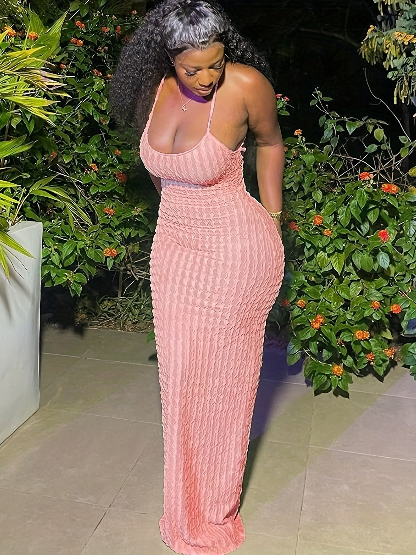 Solid Spaghetti Popcorn Dress, Sexy Backless Dress For Spring & Summer, Women's Clothing