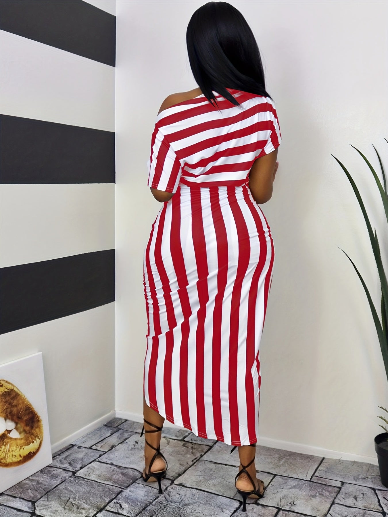 Striped Off Shoulder Dress, Casual Asymmetrical Short Sleeve Dress, Women's Clothing