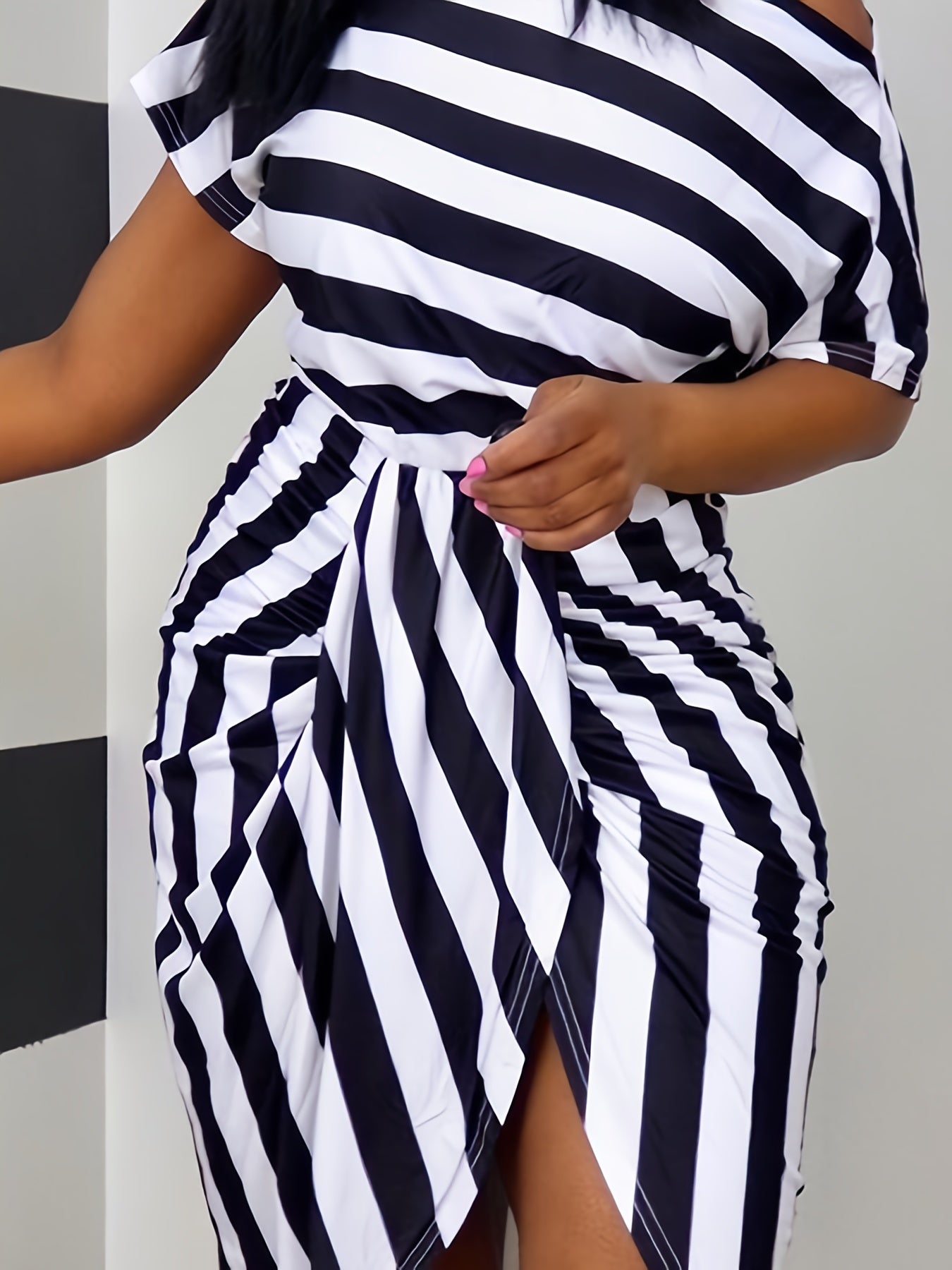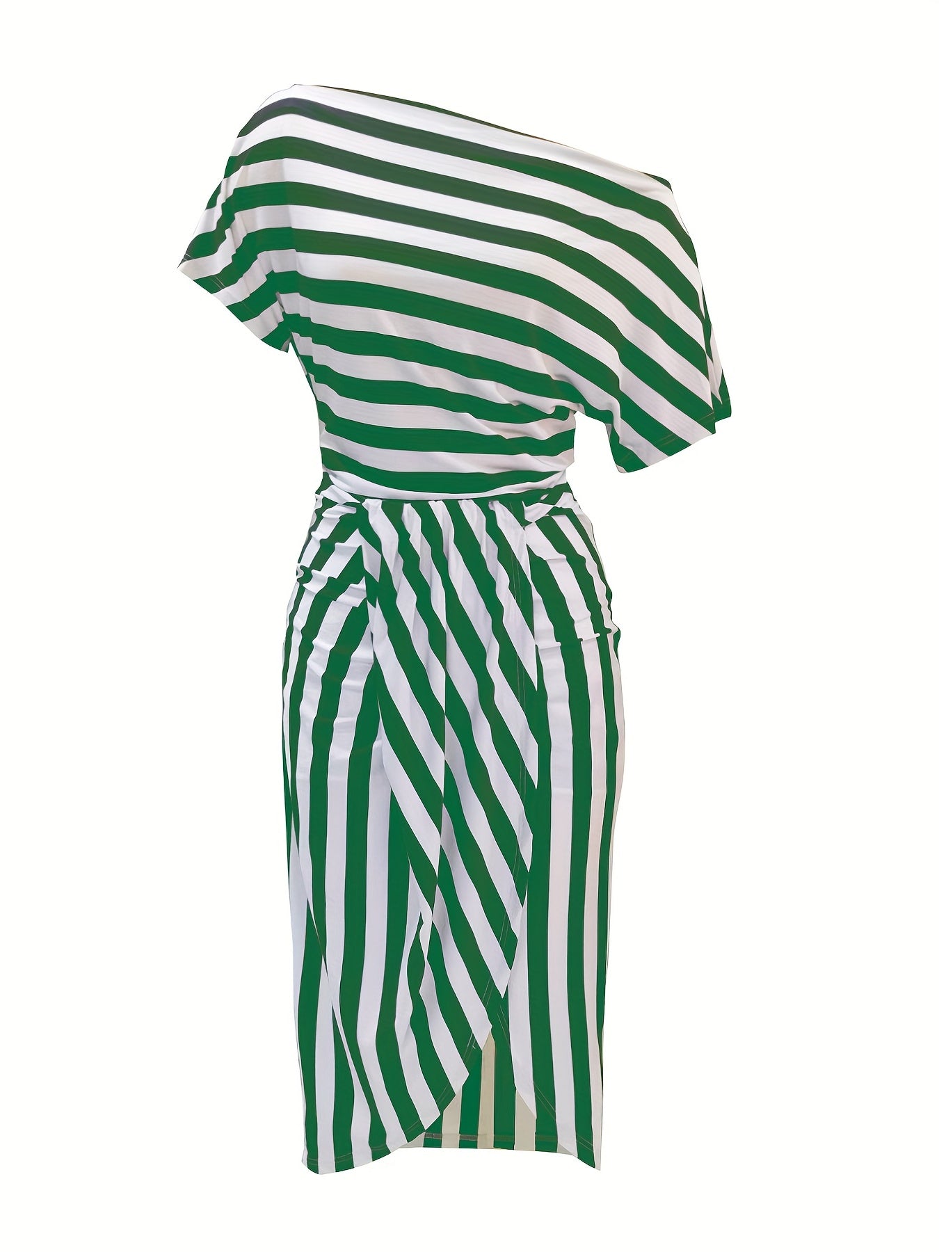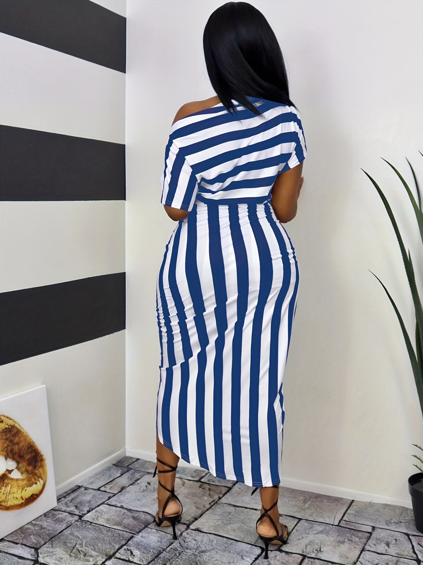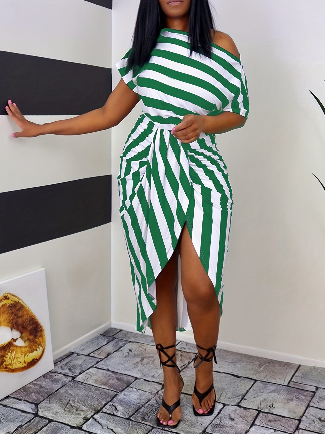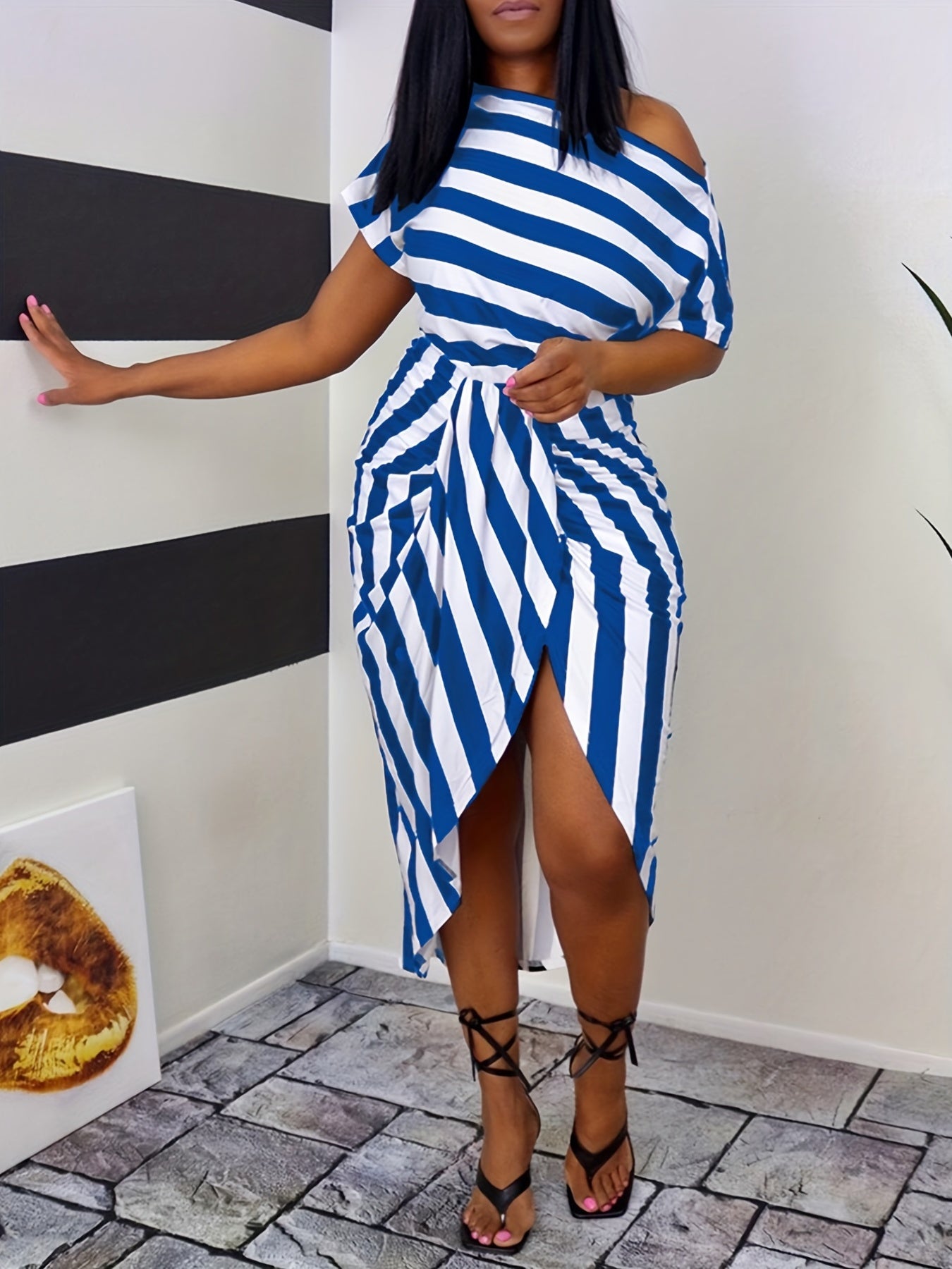 Striped Off Shoulder Dress, Casual Asymmetrical Short Sleeve Dress, Women's Clothing