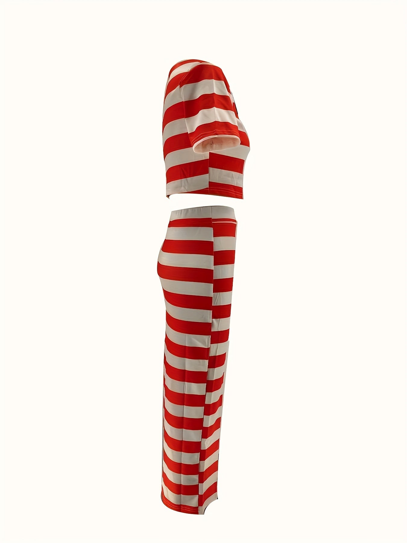 Striped Pattern Skirt Set Outfit - Stylish Crew Neck Short Sleeve Crop Top & Flowy Skirt with Relaxed Fit, Casual and Comfortable Style - Ideal for Spring and Summer, Womens Clothing