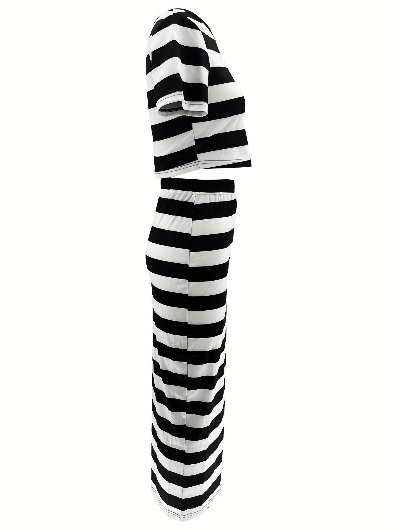 Striped Pattern Skirt Set Outfit - Stylish Crew Neck Short Sleeve Crop Top & Flowy Skirt with Relaxed Fit, Casual and Comfortable Style - Ideal for Spring and Summer, Womens Clothing