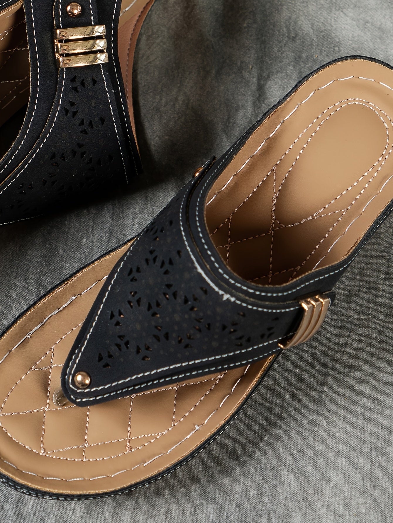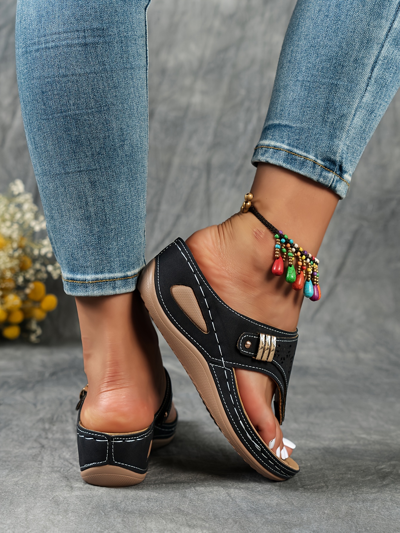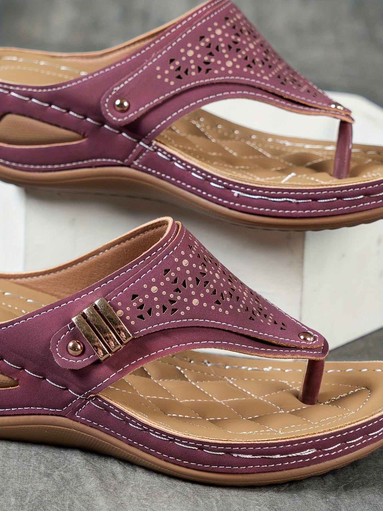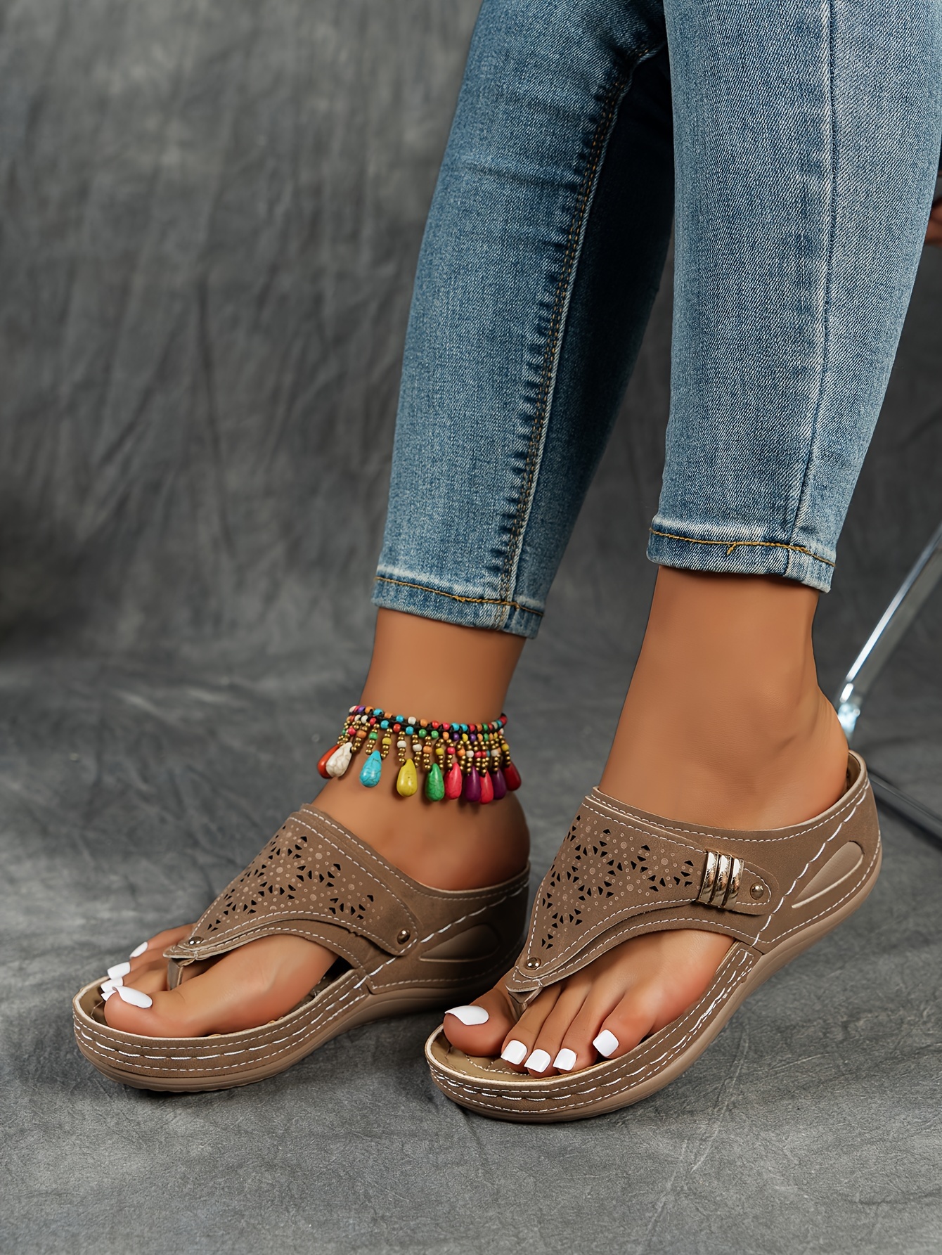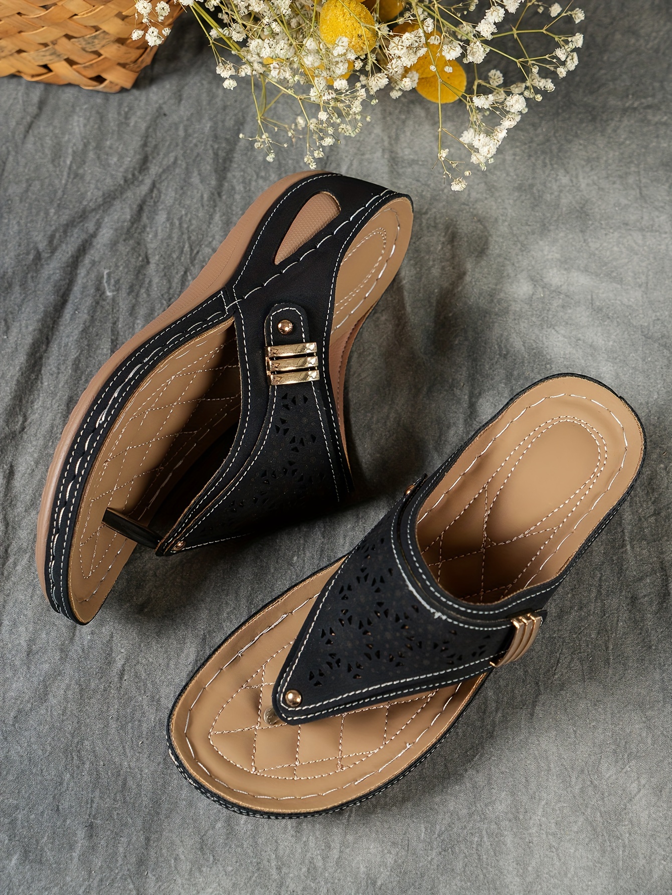 Stylish Cut-Out Thong Sandals - Soft Metallic Platform Wedge, Comfortable Beach Slides with Adjustable Straps, Vacation Essentials for Women