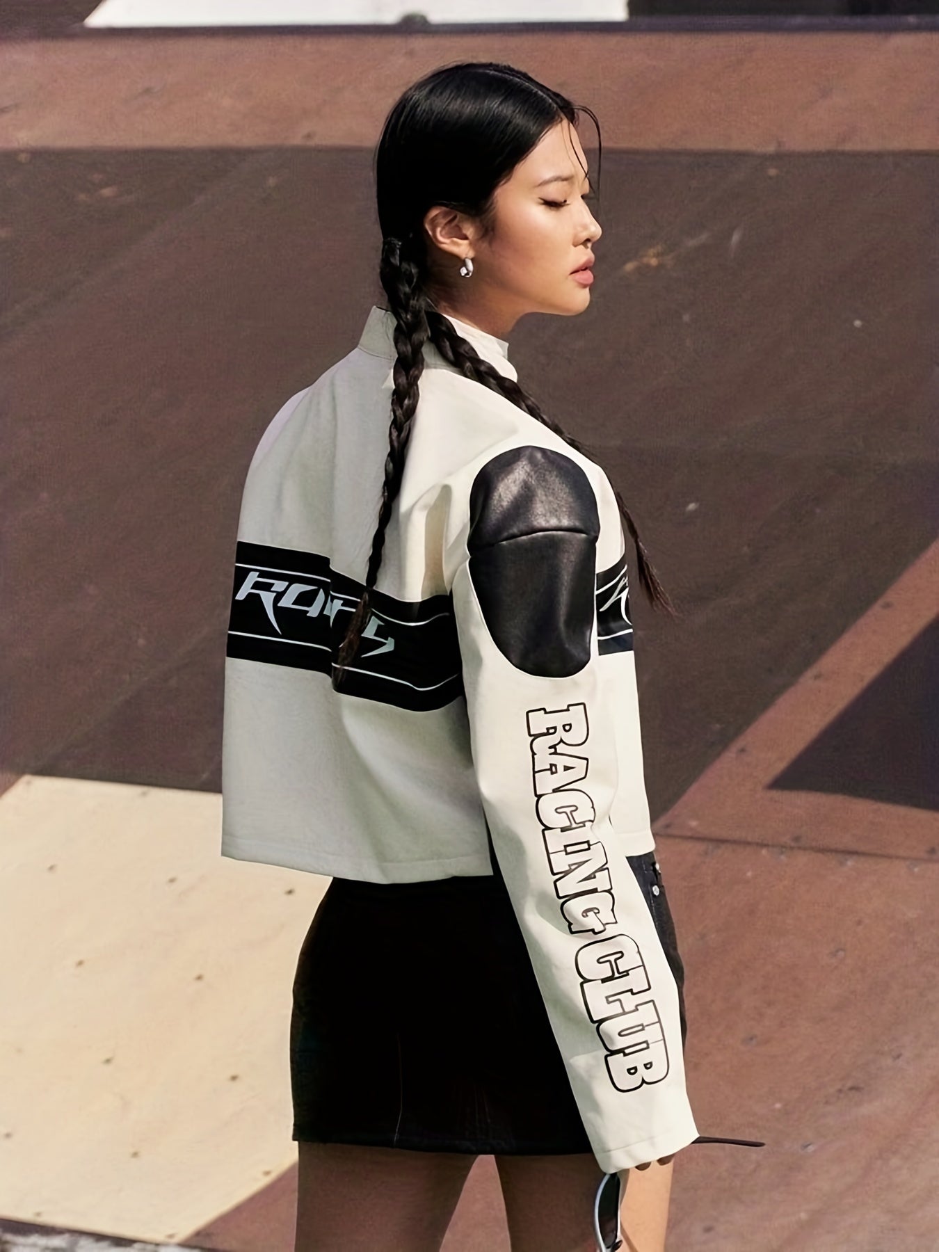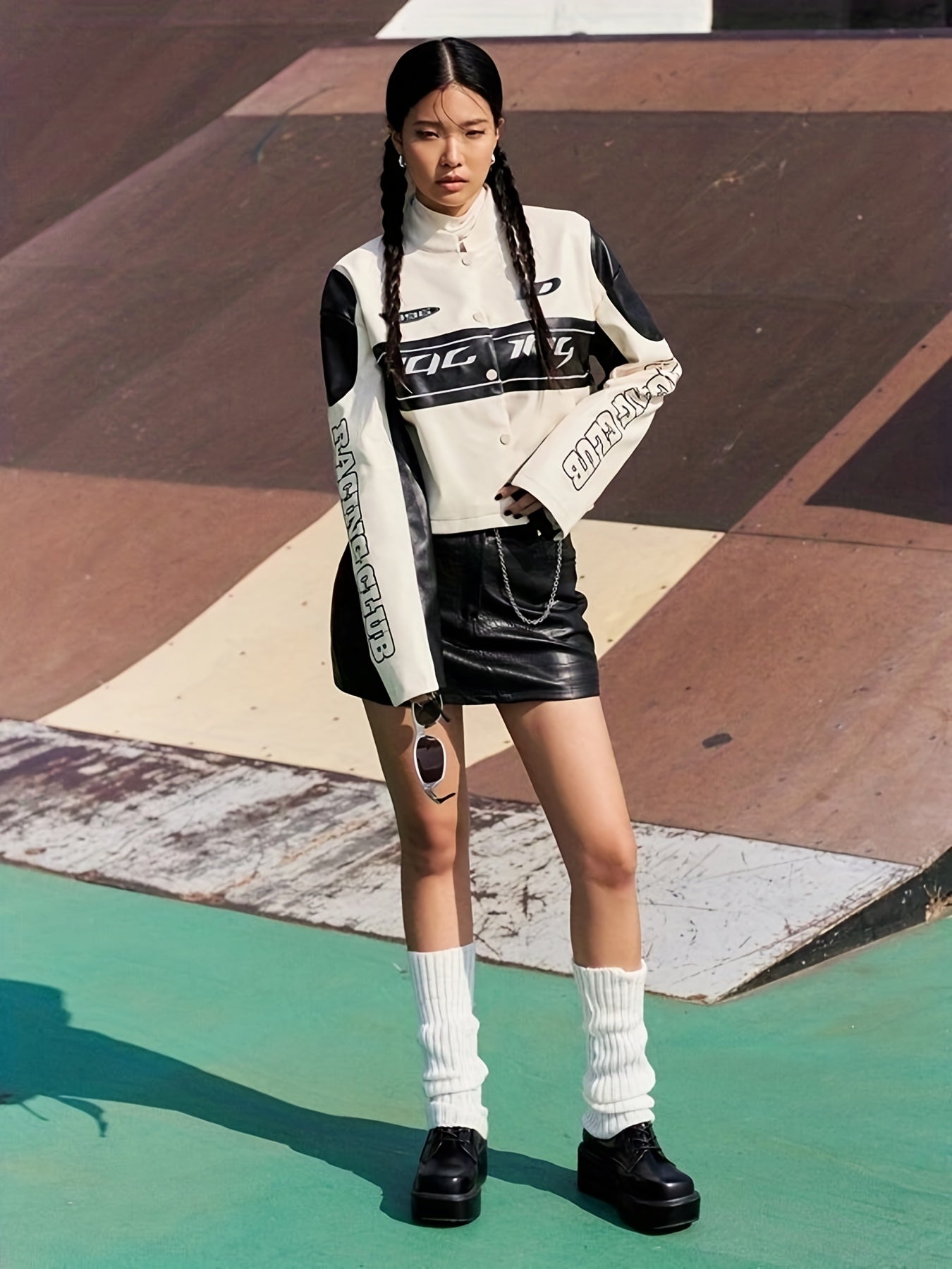 Stylish Faux Leather Long Sleeve Crop Jacket with Letter Print Button Front - Women's Fashion Outerwear for Chic Look - Faux Leather