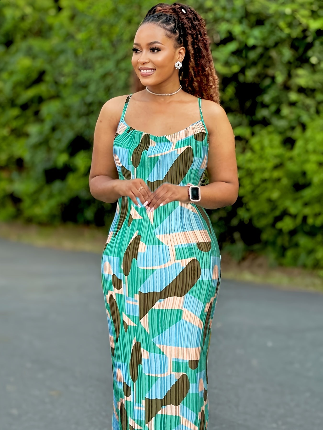 Tie Dye Print Pleated Dress, Summer Spaghetti Strap Bodycon Dress, Women's Clothing