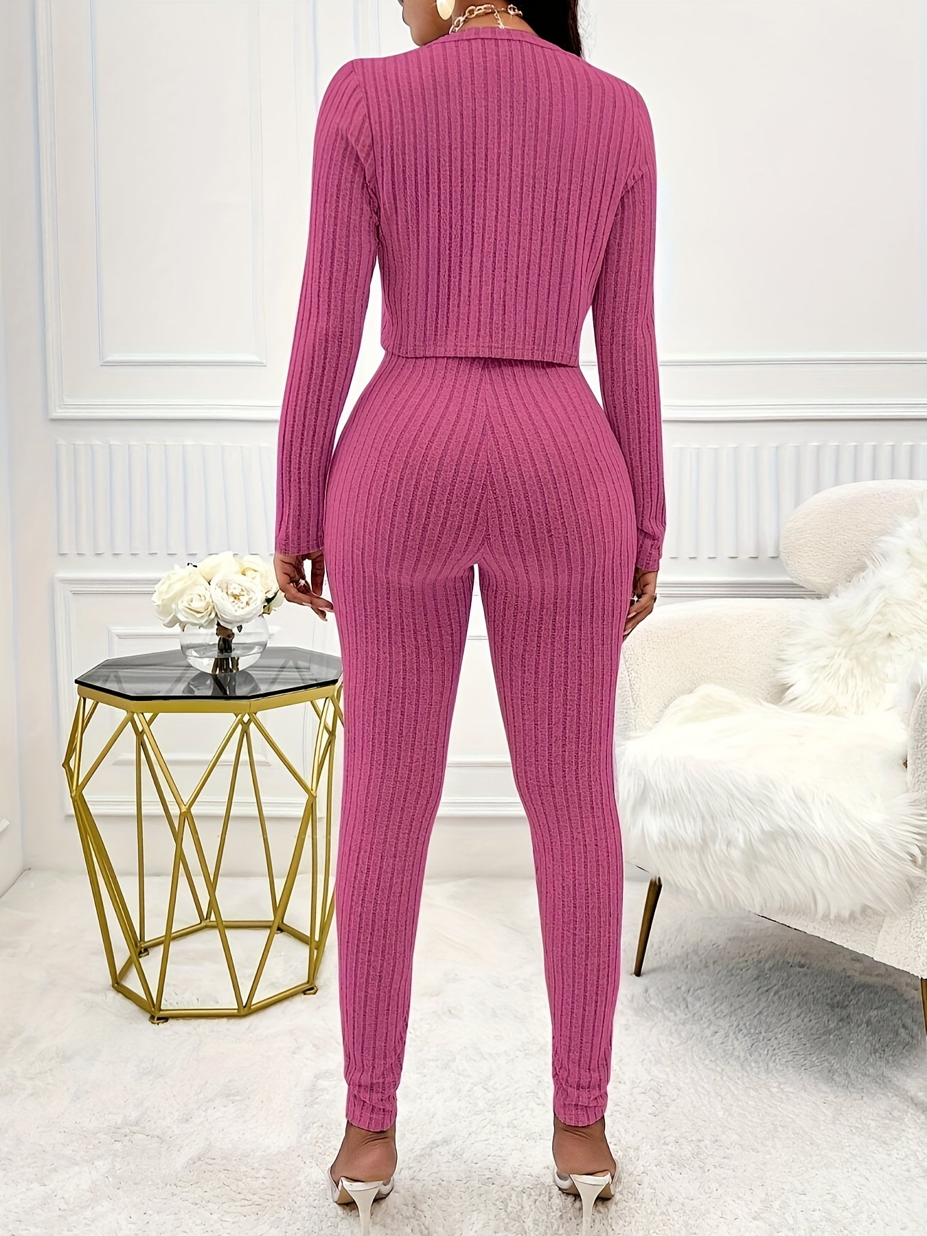 Two-Piece Ribbed Outfit Set - Long Sleeve Button Front Crop Cardigan & Skinny Strapless Jumpsuit - Soft, Stretchy, and Cozy Women's Clothing for Everyday Wear