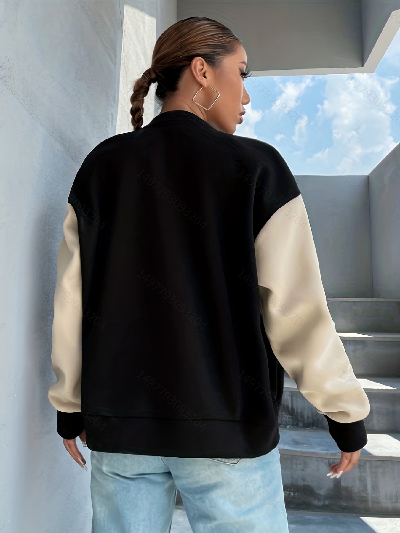 Varsity Jacket with Letter Patch - Relaxed Fit Drop Shoulder, Stylish Two-Tone, Casual Outwear for Spring & Fall, Perfect for Womens Daily Wear