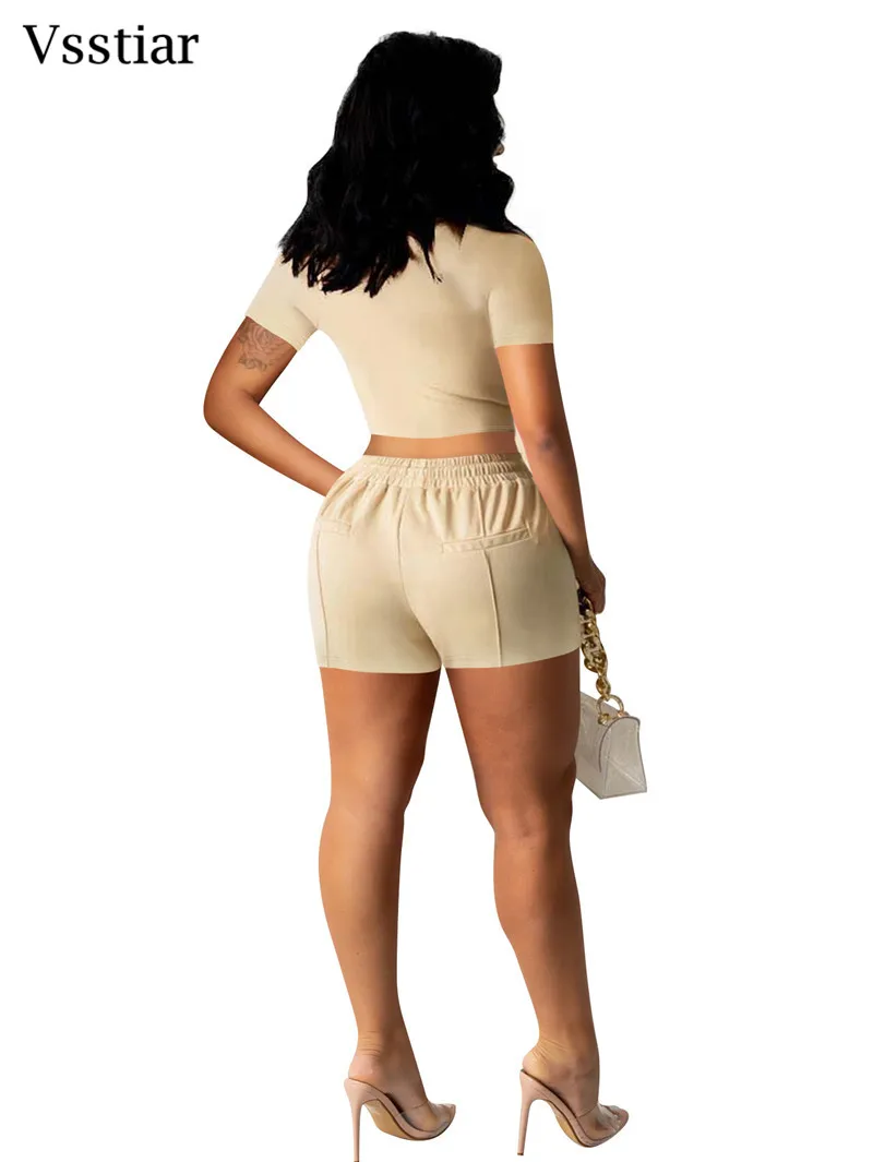 Vsstiar Short Sleeve Square Collar Crop Top And Shorts Summer Solid Color Slim Women Two Piece Set Fashion Casual Tracksuit