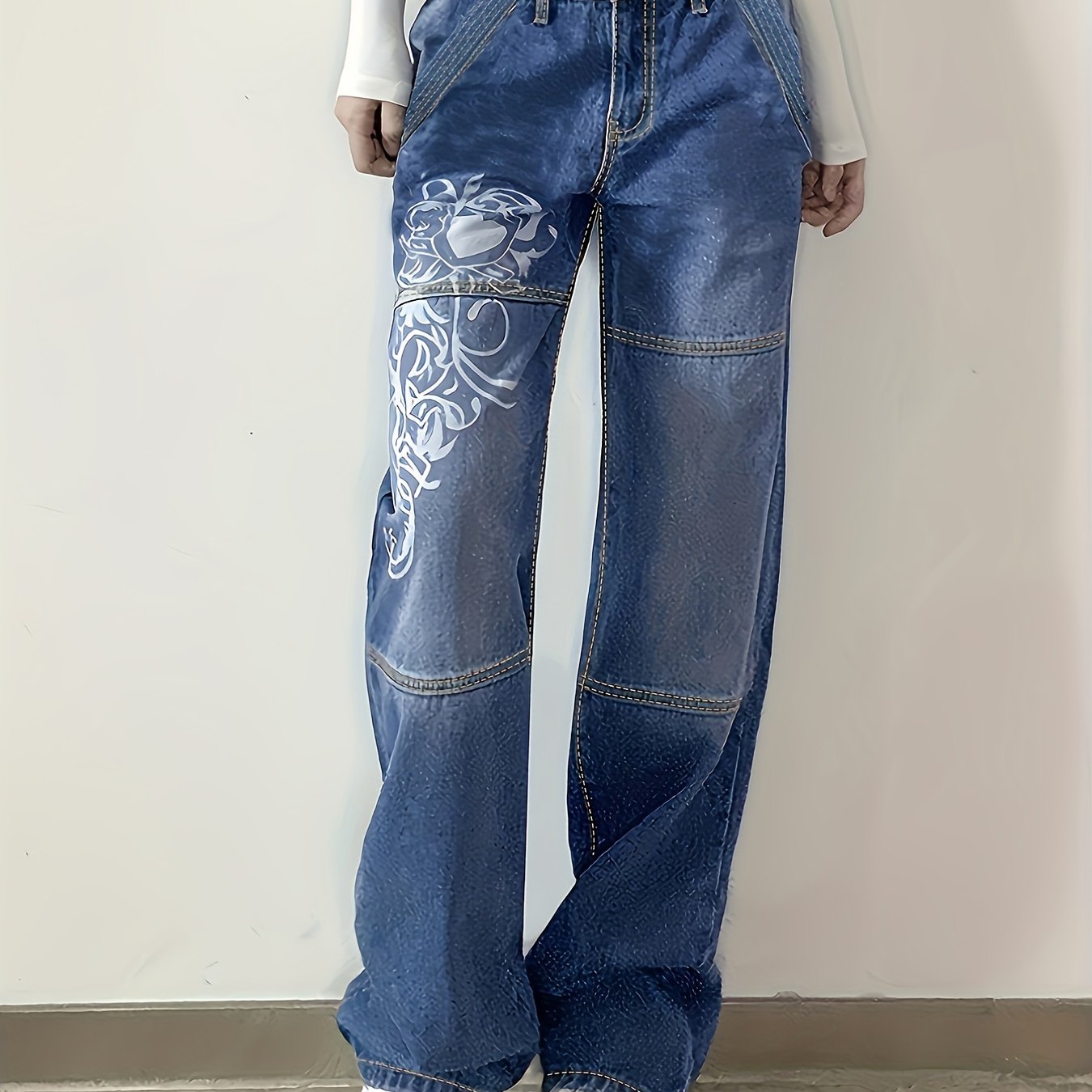 White Floral Print Thigh High Rise Loose Baggy Fit Straight Lets Plicated Hem Sectional Design High Waist Boyfriend Jeans, Women's Denim Jeans, Women's Clothing