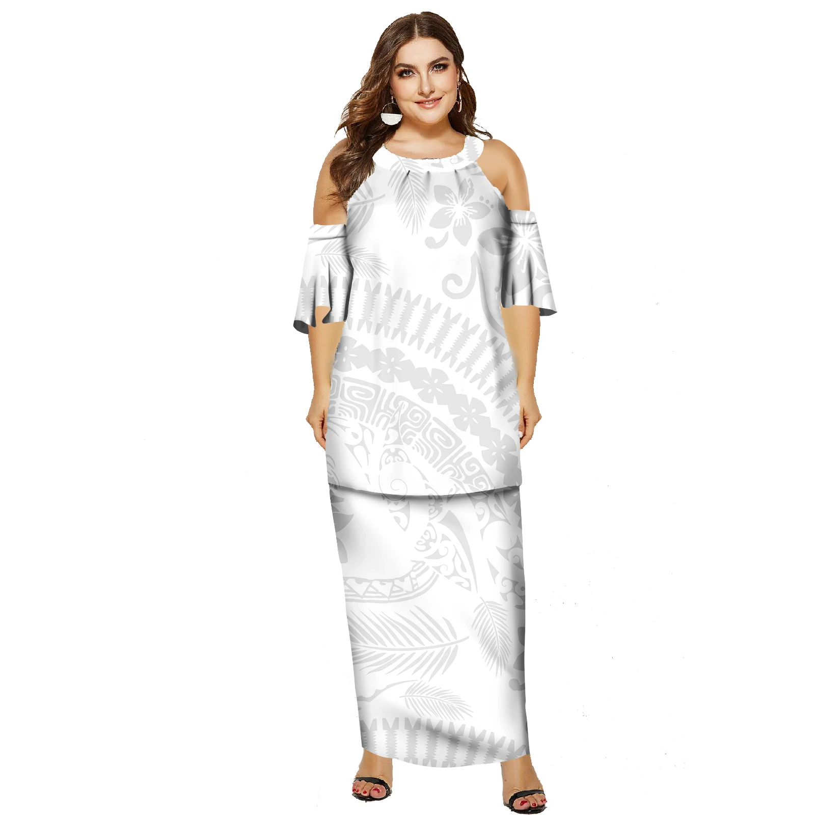 Wholesale Price Island Two Pieces Puletasi Hawaii Party Dress Polynesian Tribal Print White Lady O-neck Puletasi Dresses