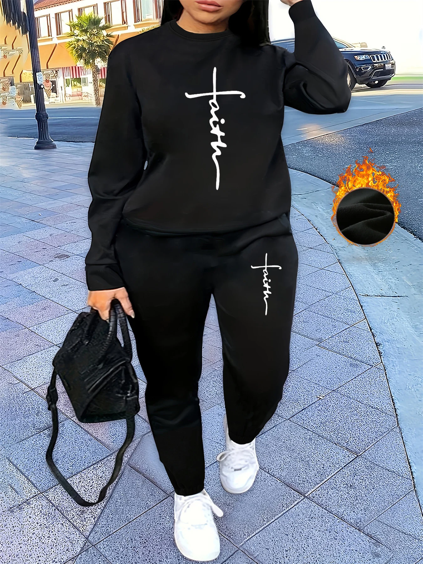 Women's autumn and winter hip-hop casual street cross graphic printed round neck sports shirt+sports pants set warm clothing
