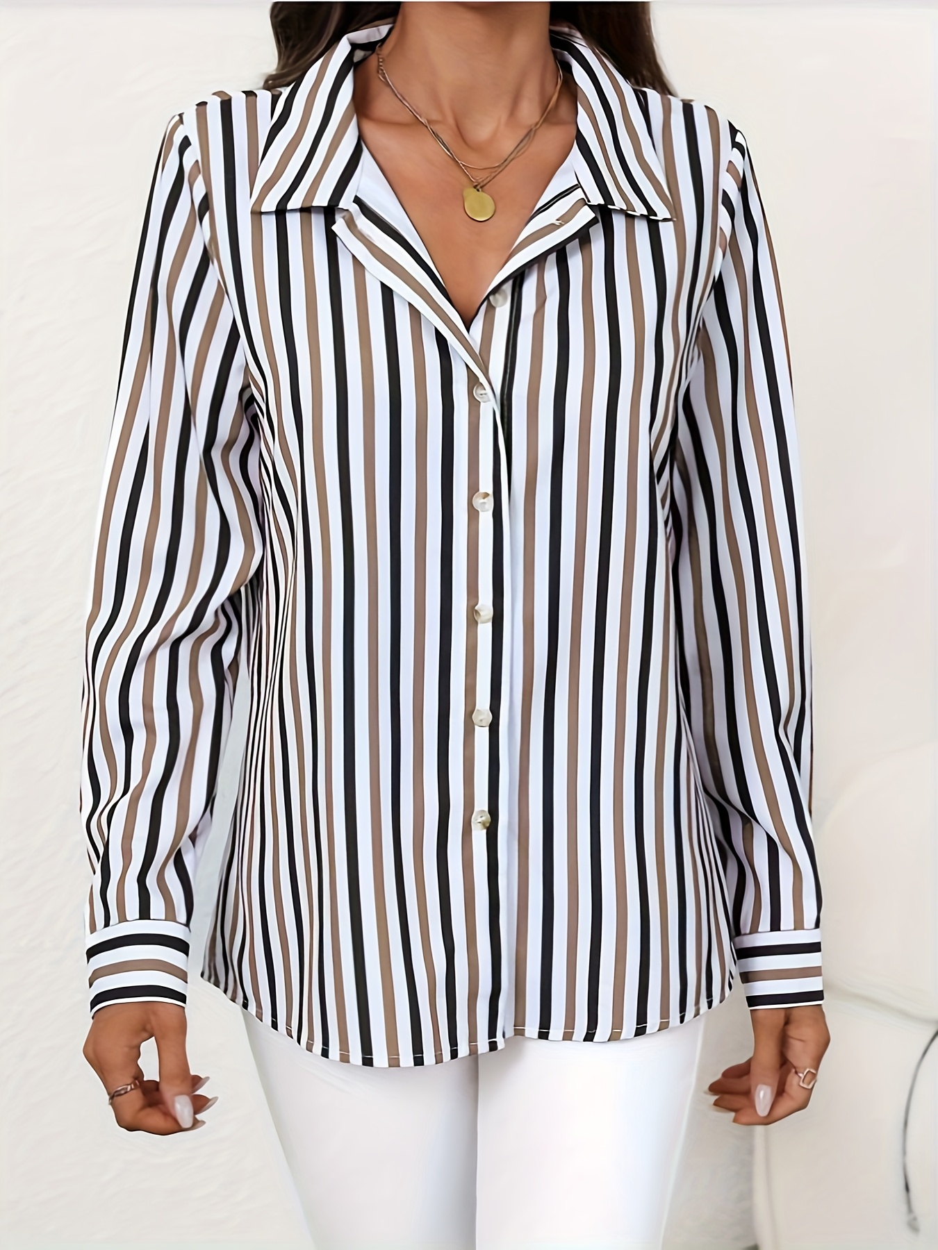 Women's Black & White Striped Long Sleeve Single-Breasted Casual Shirt - Elegant Middle Eastern-Inspired Button-Up Blouse with Classic Collar, Machine Washable Non-See-Through Fabric for Spring Summer Fall, Long Sleeve Blouse