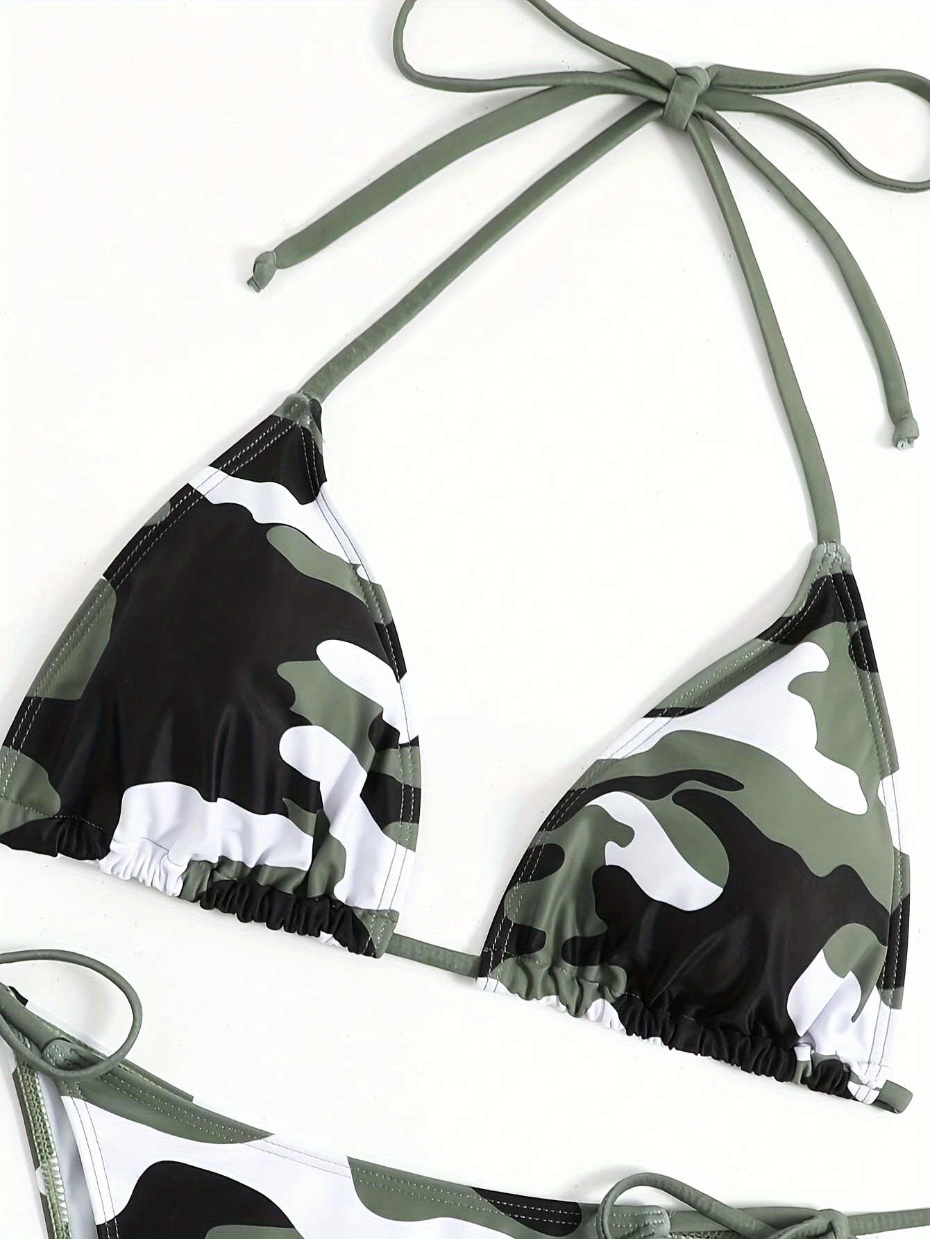 Women'S Camo Print Bikini Set with Lace-Up Detail - Stretchy Medium Fabric, Green & White Pattern, Strapless Swimsuit for Beach or Pool, Beach Swimsuit|Camouflage Swimsuit|Stretchy Fabric