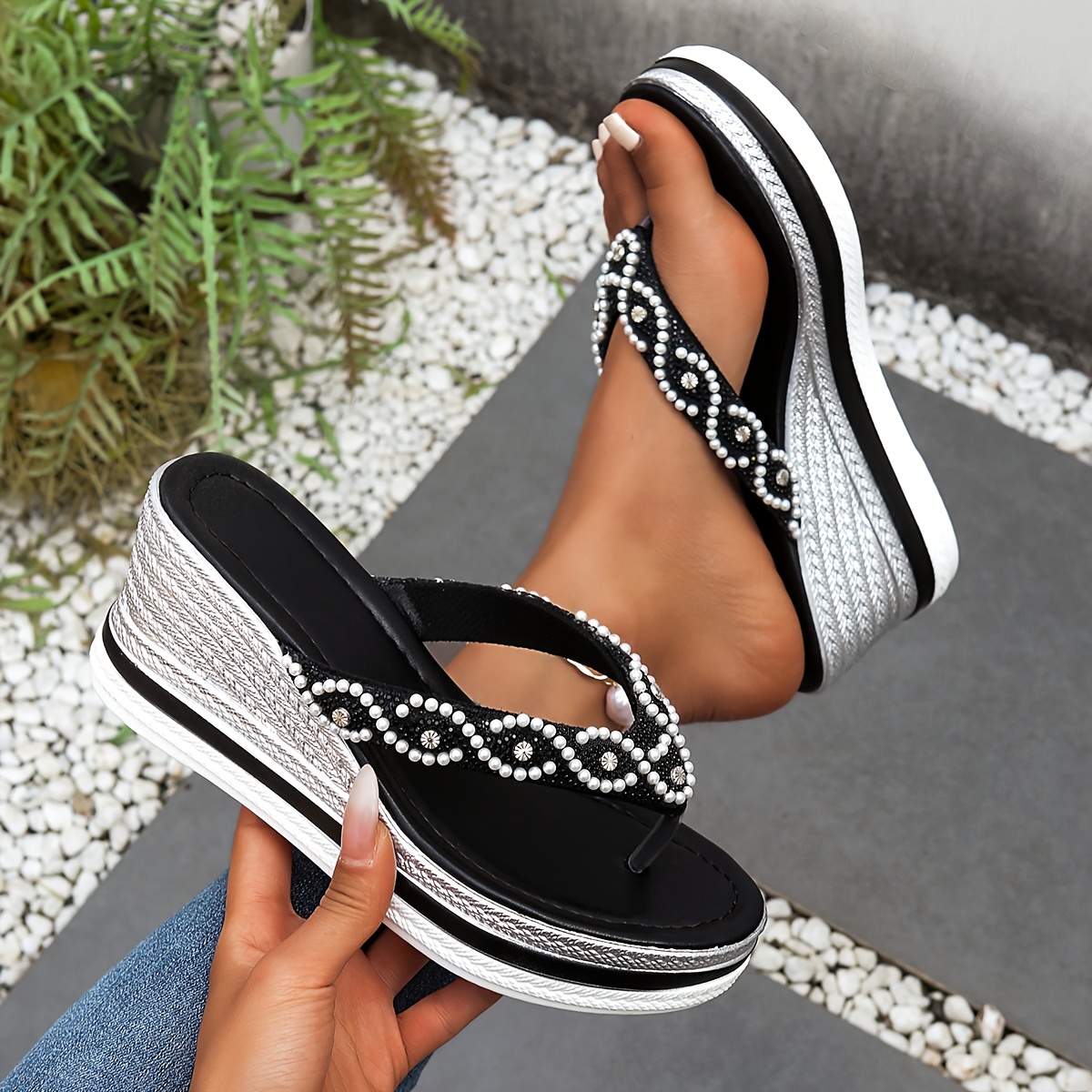 Women'S Rhinestone-Embellished Platform Sandals - Slip-On Chunky Heel Open-Toe Slippers with Faux Cover Upper & PU Sole, All-Season Comfort for Casual & Formal Occasions, High Heel Sandals, Formal Footwear, Elegant Footwear,
