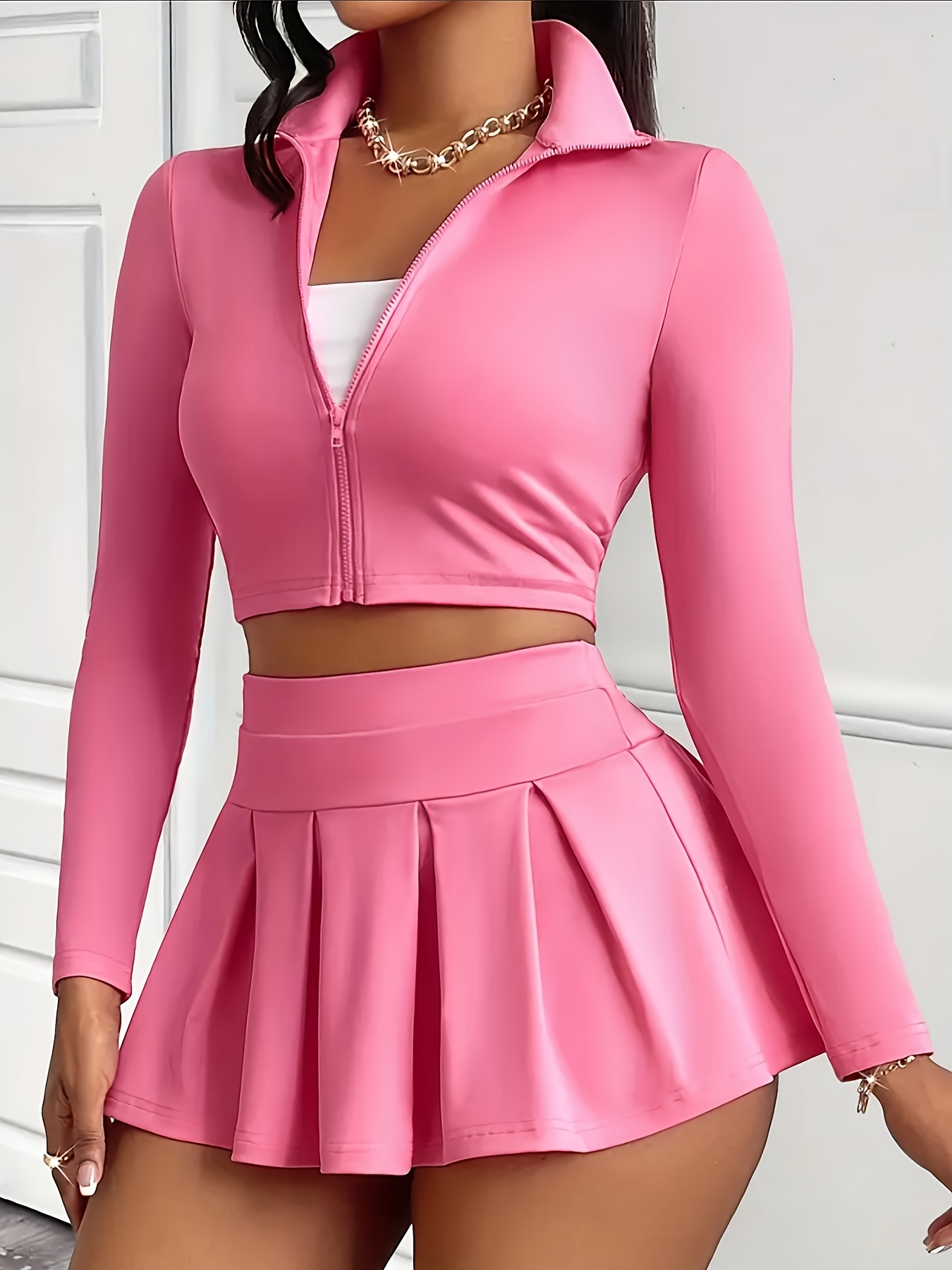 Women's Sexy Long Sleeve Jacket & Mini Pleated Skirt with High Elastic Underpants