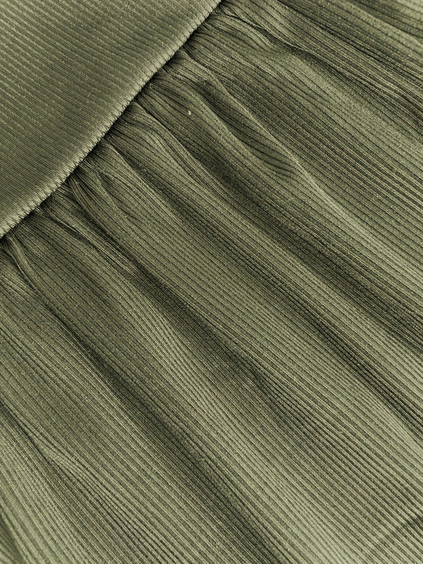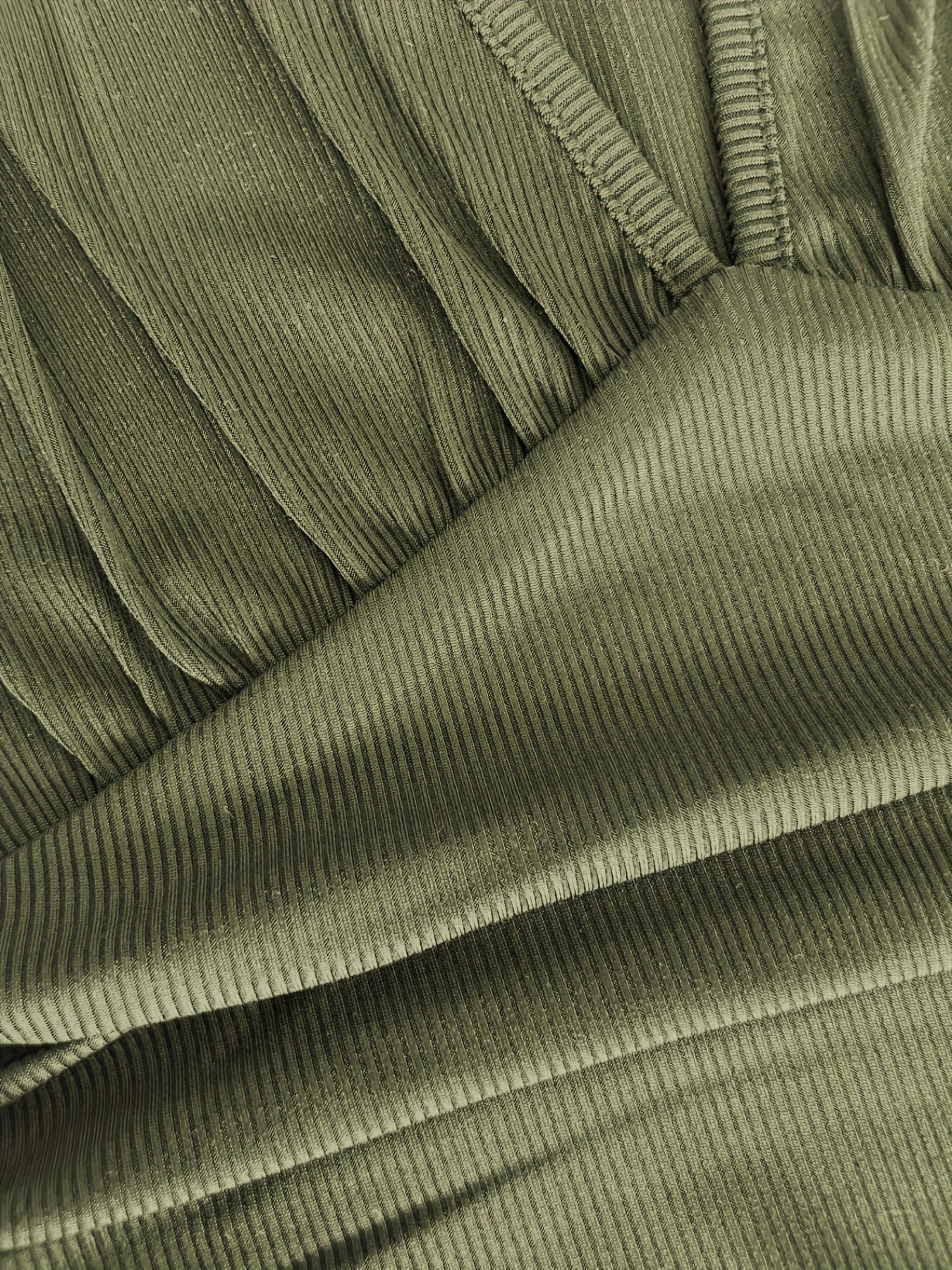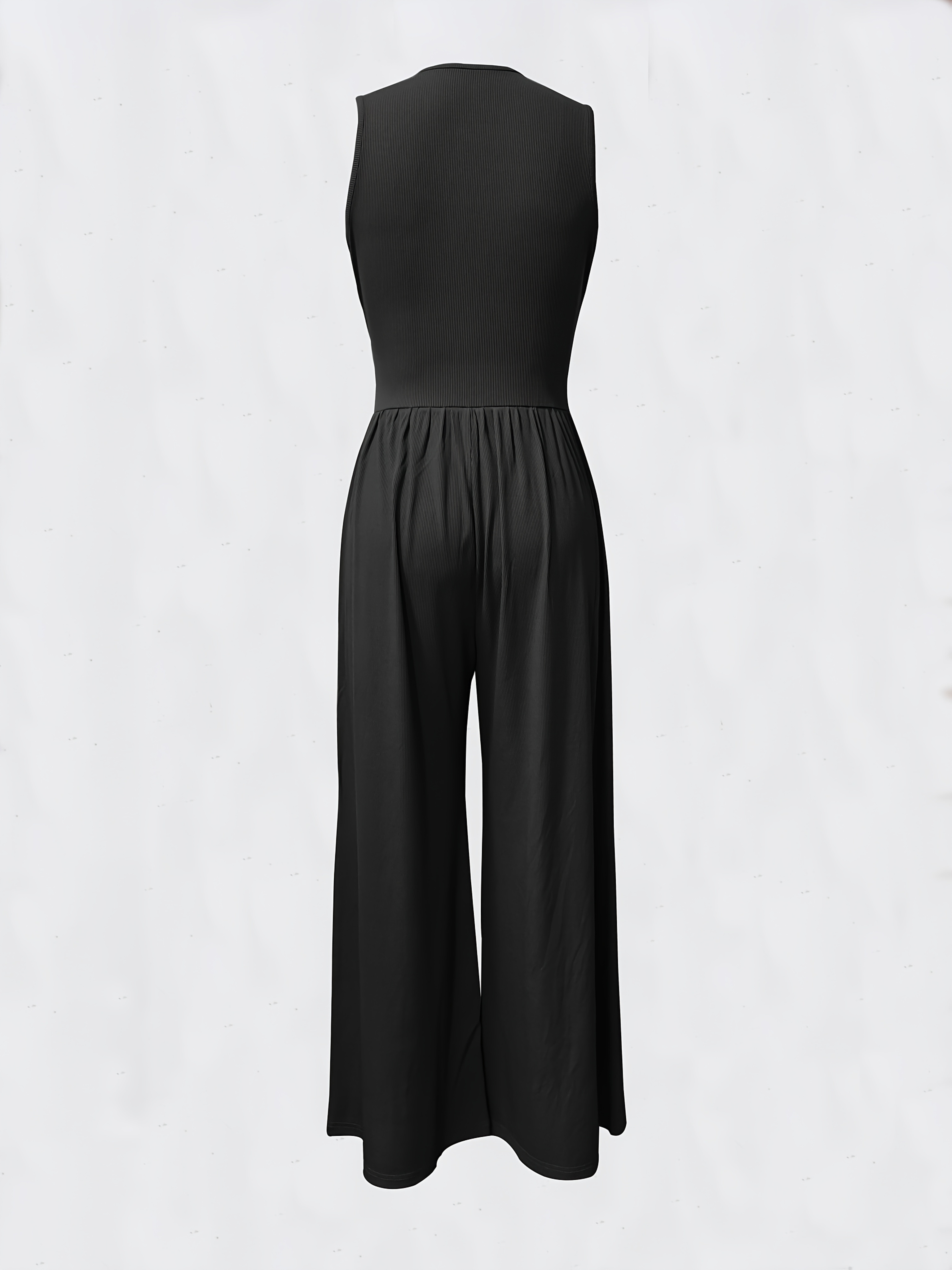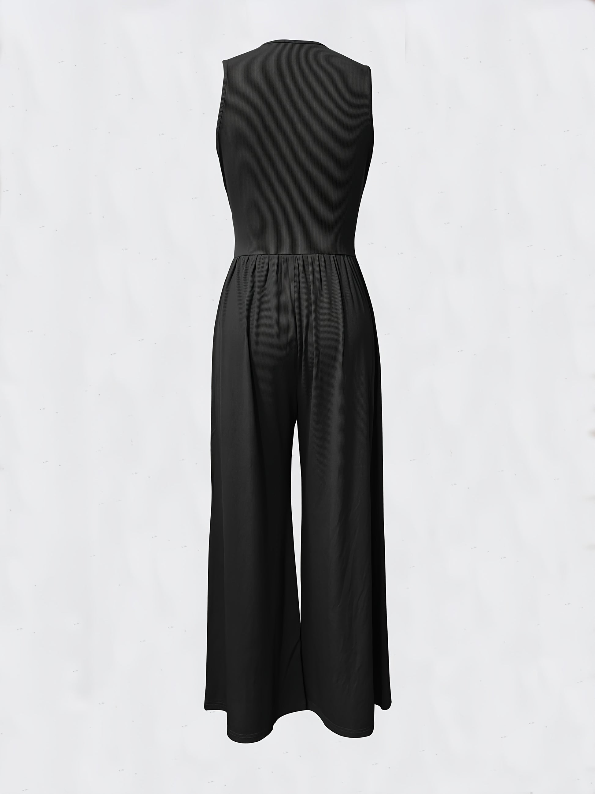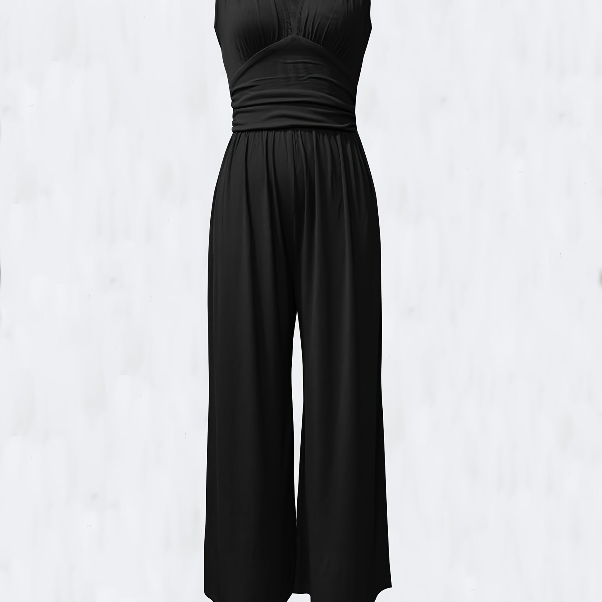 Women's Sleeveless Deep V-Neck Ruched Wide-Leg Jumpsuit - Olive Green Textured Stretch Fabric, Machine Washable Elegant Spring/Summer Casual & Formal Outfit, Ladies Rompers And Jumpsuits, Versatile Clothing, Flowing Silhouett
