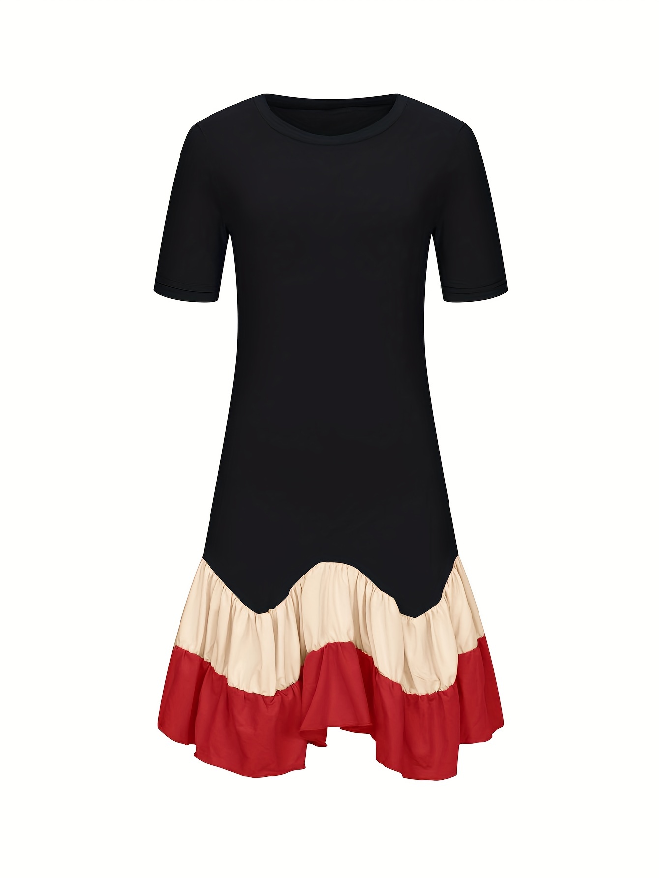 Women's Summer Color Block A-Line Dress - Black & Red Pleated Skirt, Breathable Short Sleeve, Machine Washable, Vacation & Casual Wear, Summer Fashion, Nontransparent Material